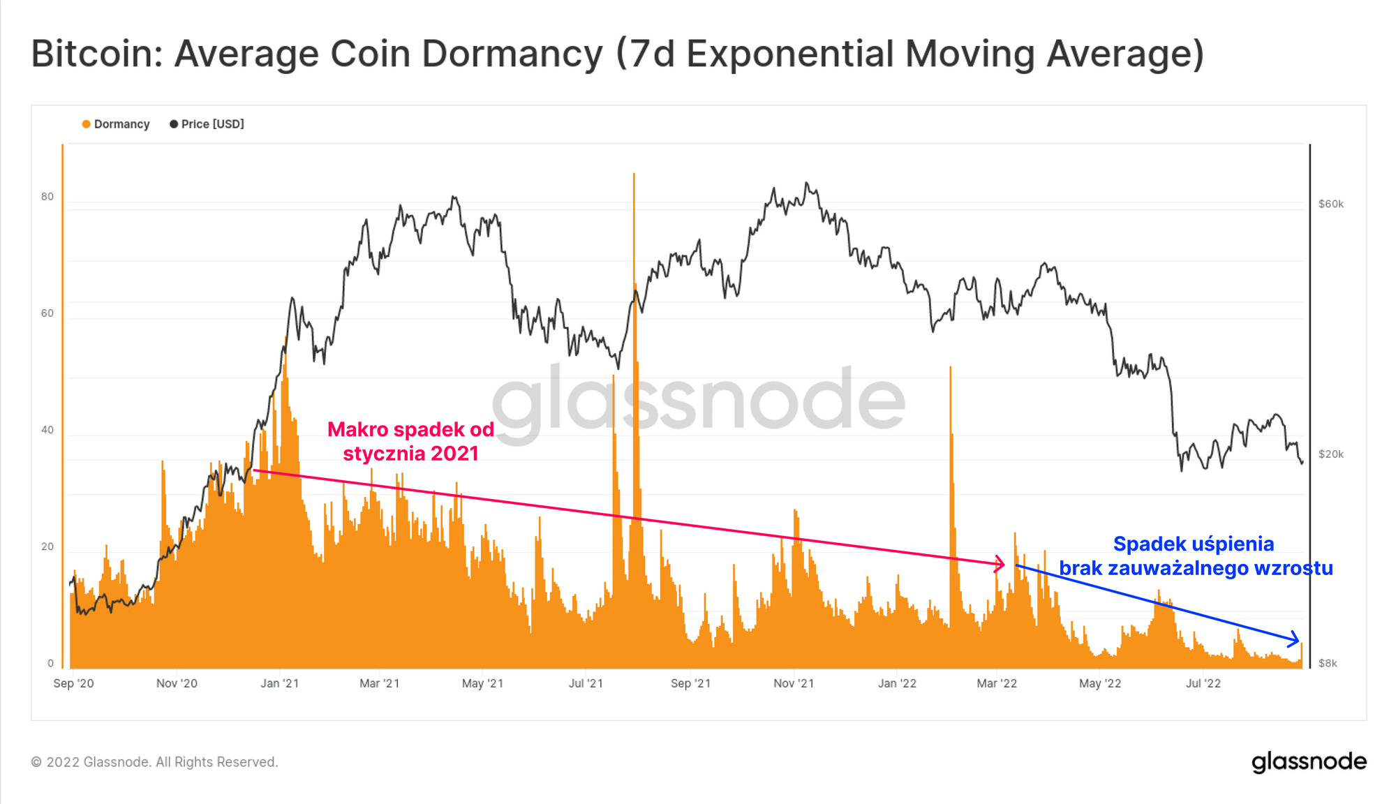 Możemy przyjrzeć się temu dokładniej patrząc na stan uśpienia, który jest średnim wiekiem przemieszczonego po sieci coina. Ten wskaźnik uwzględnia sprzedawany wolumen. Widzimy tutaj, że średni wiek coina jest zbliżony do wieloletnich minimów, co oznacza, ze skok ASOL był w rzeczywistości oparty o bardzo mały wolumen (mała ilość starych coinów została sprzedana), co wzmacnia nam wniosek o bardzo słabym popycie na Bitcoina.
