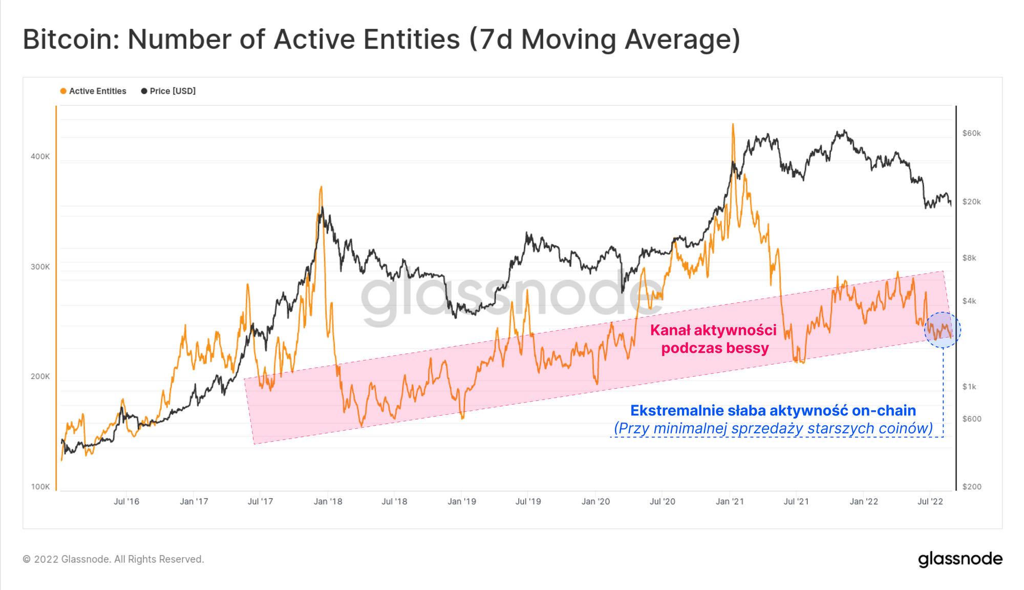 Aby podkreślić tę fundamentalną słabość, możemy nasze wnioski uzupełnić poniższym wykresem Aktywnych Podmiotów. Wskaźnik ten może być postrzegany za analogiczny do „unikatowych dziennych aktywnych użytkowników” sieci Bitcoina. Testuje on obecnie dolny poziom długoletniego kanału bessy.