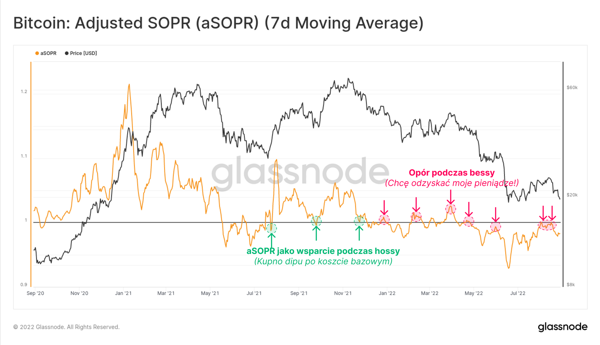 🔔 Pomysł na alert: Przebicie powyżej poziomu 1,0 na wykresie aSOPR (7DMA) sygnalizowałoby, że łącznie sprzedawane coiny są z powrotem w zysku, sugerując korzystne warunki rynkowe i potencjalny powrót popytu.