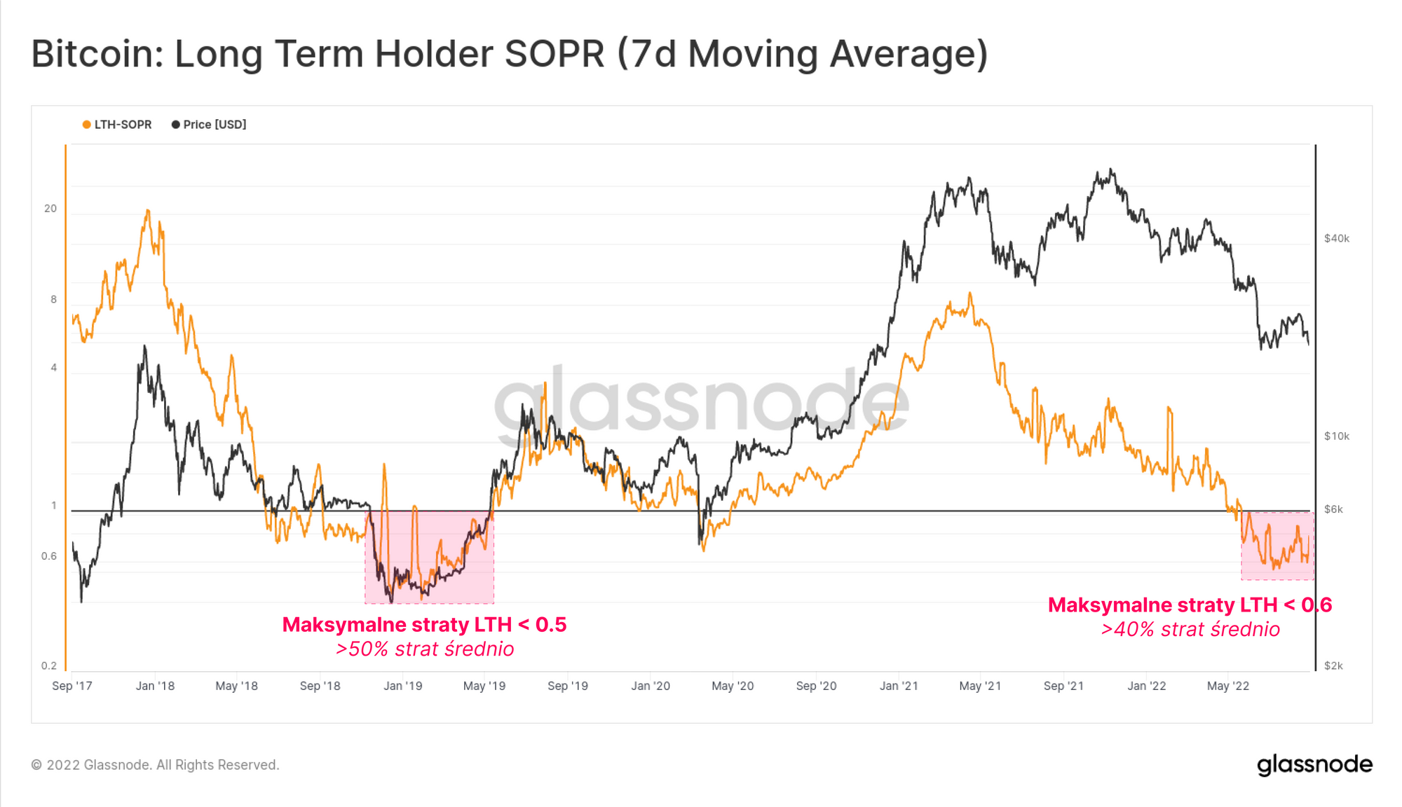 Chociaż nie jest tak dotkliwe jak szczytowe straty -50% w 2018 r., obecna bessa konkuruje w znaczący sposób z najgorszymi bessami z przeszłości w kategorii wielkości wyrządzonych szkód. Znaczące przebicie przez wykres LTH-SOPR poziomu 1,0 byłoby konstruktywnym sygnałem, jednak historycznie osiągnięcie prędkości ucieczki zajmowało wiele miesięcy.