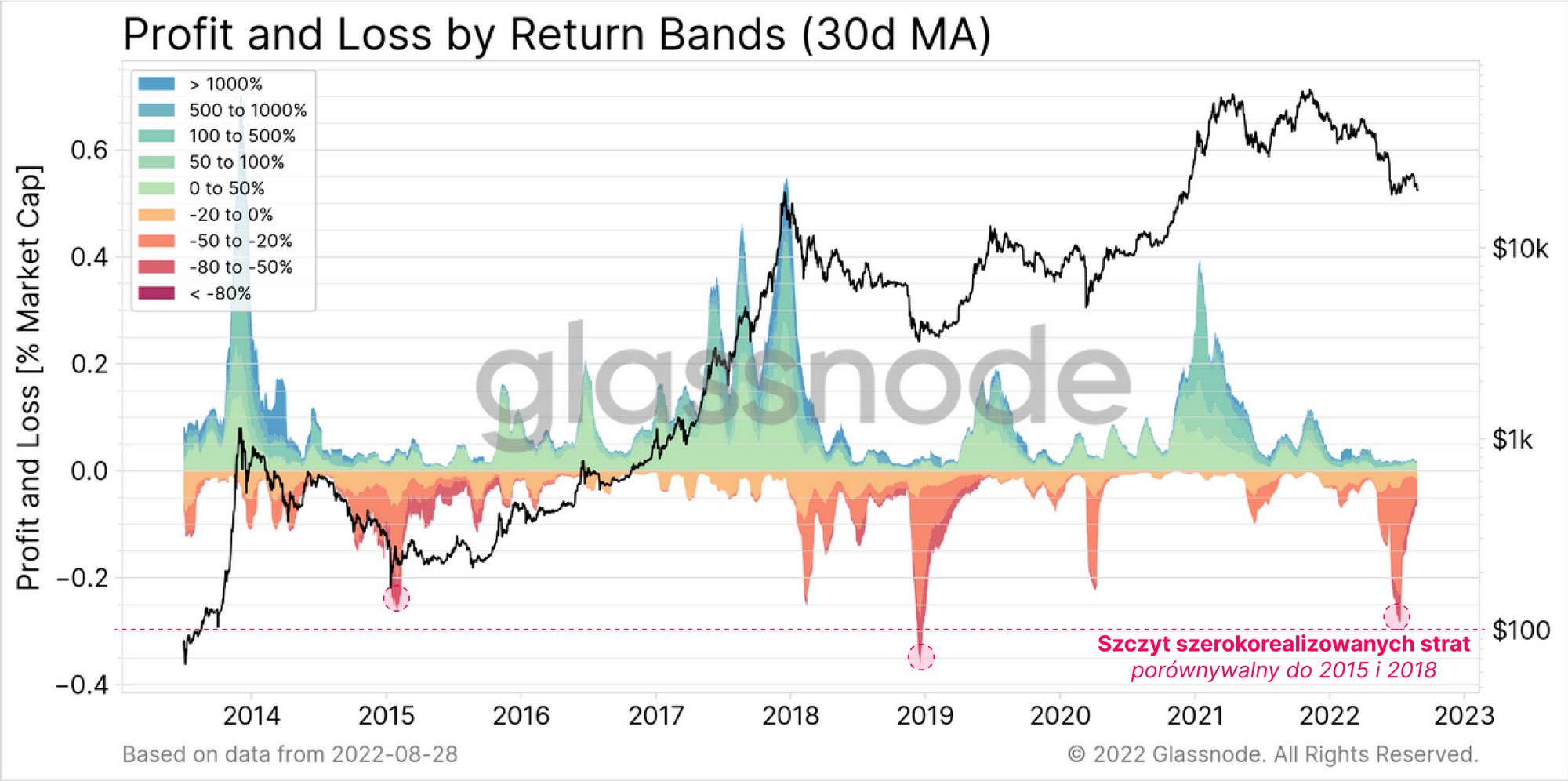 Na koniec zamkniemy zbiorczym widokiem ostatnich strat on-chain, gdzie widzimy, że skala odpływu kapitału w ciągu ostatniego miesiąca jest historyczna. Przewyższa ją jedynie kapitulacja z 2018 r., względna wielkość strat inwestorów w ostatnich tygodniach jest ogromna, osiągając 0,28% kapitalizacji rynkowej dziennie.