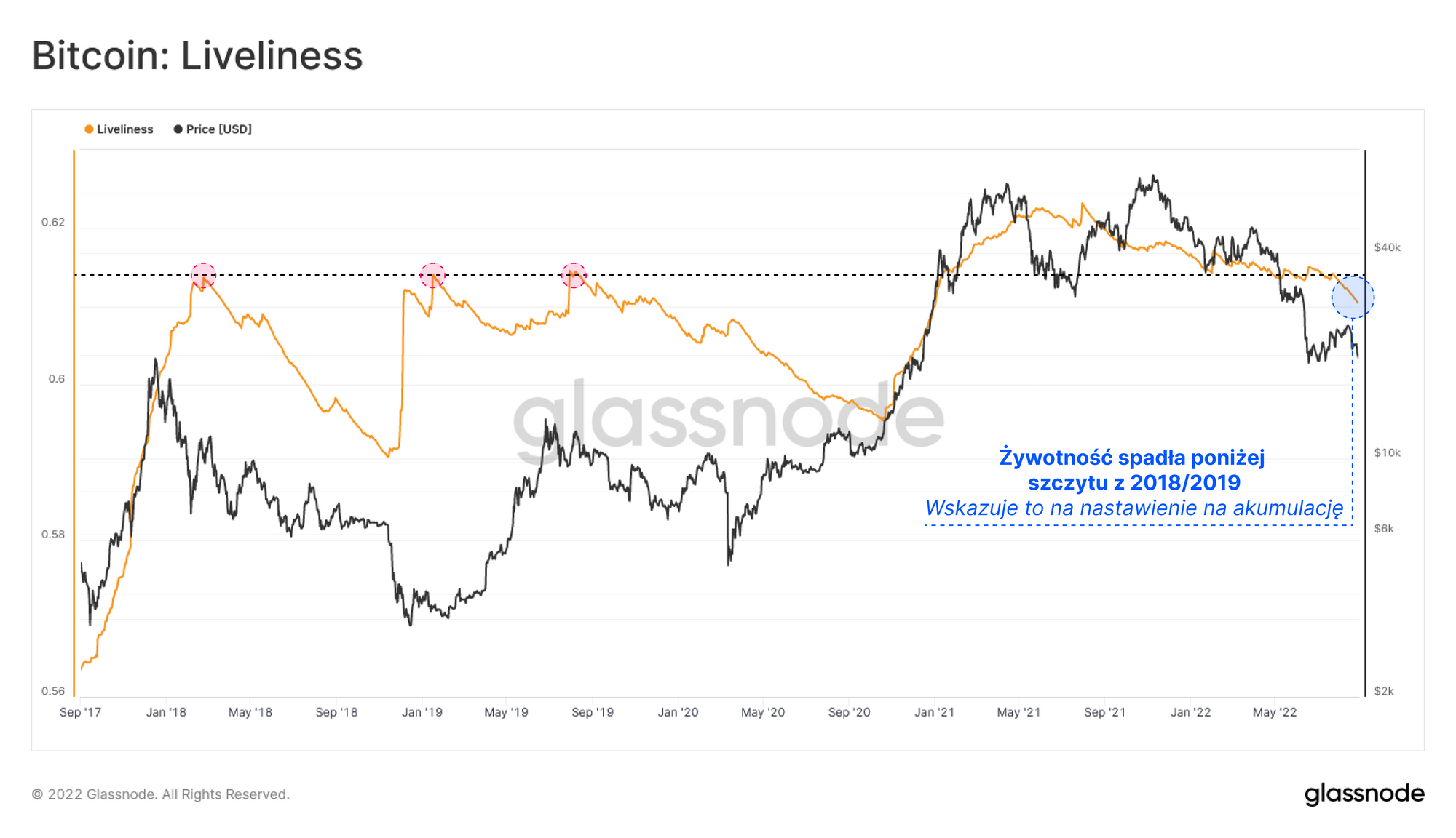 Oceniając okres od listopada 2020 do dnia dzisiejszego, możemy zauważyć, że makro nastawienie na HODLing jest na wieloletnim szczycie sięgającym 70 tys. BTC/miesiąc i jest spójne z wiarą inwestorów długoterminowych (nawet jeśli price action pozostaje tragiczne).