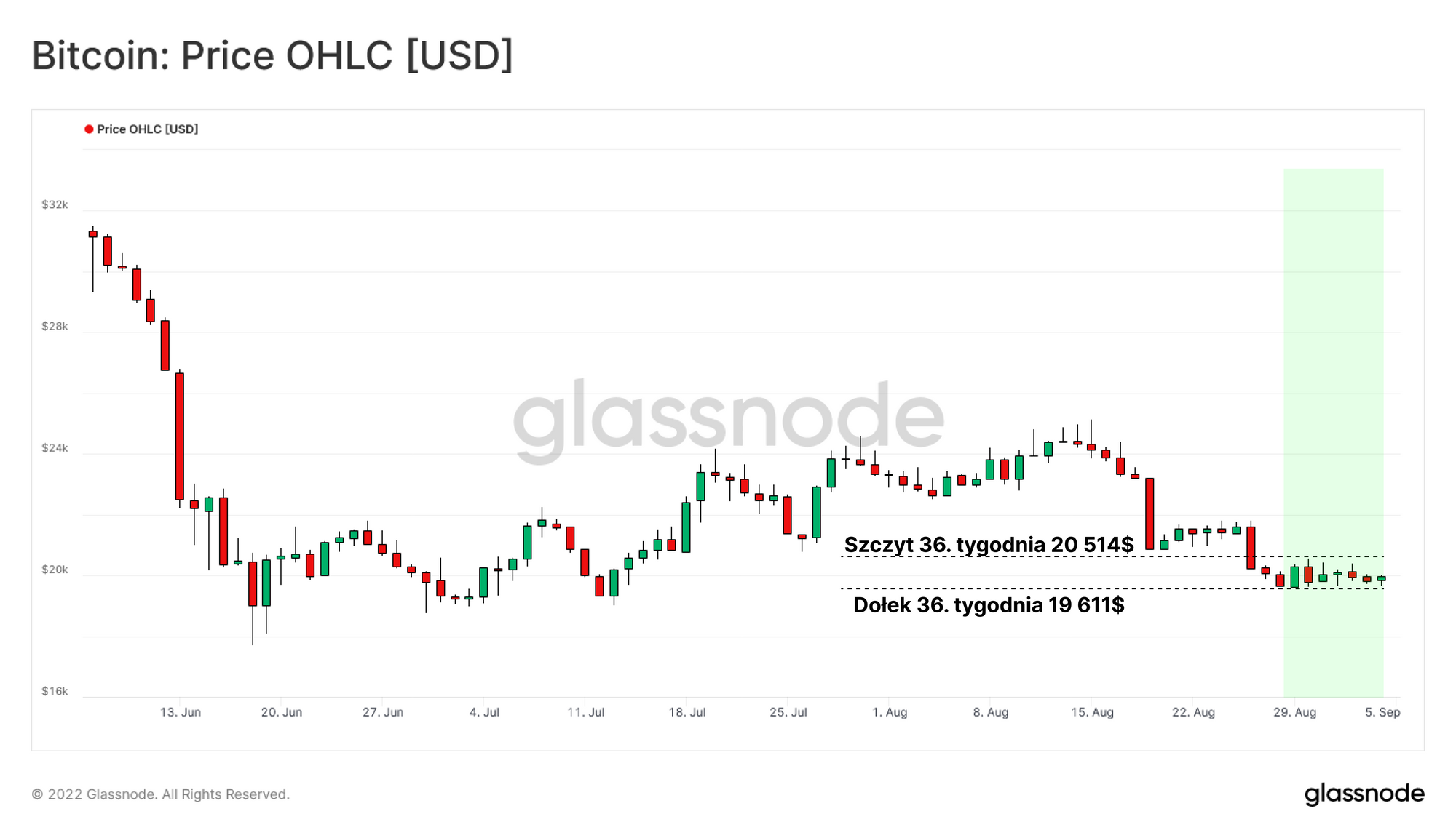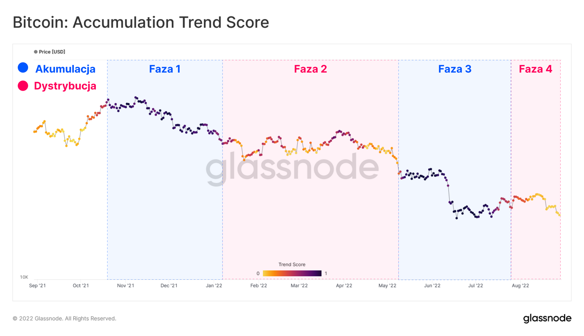 - Faza 4 (Dystrybucja): Po miesiącach akumulacji rynek zdołał wzrosnąć powyżej 24 tys. USD, jednak, jak opisano w newsletterze z 34. tygodnia oraz 35. tygodnia, możliwość wykorzystania płynności do wyjścia z rynku została wykorzystana przez dystrybucję i realizację zysków.