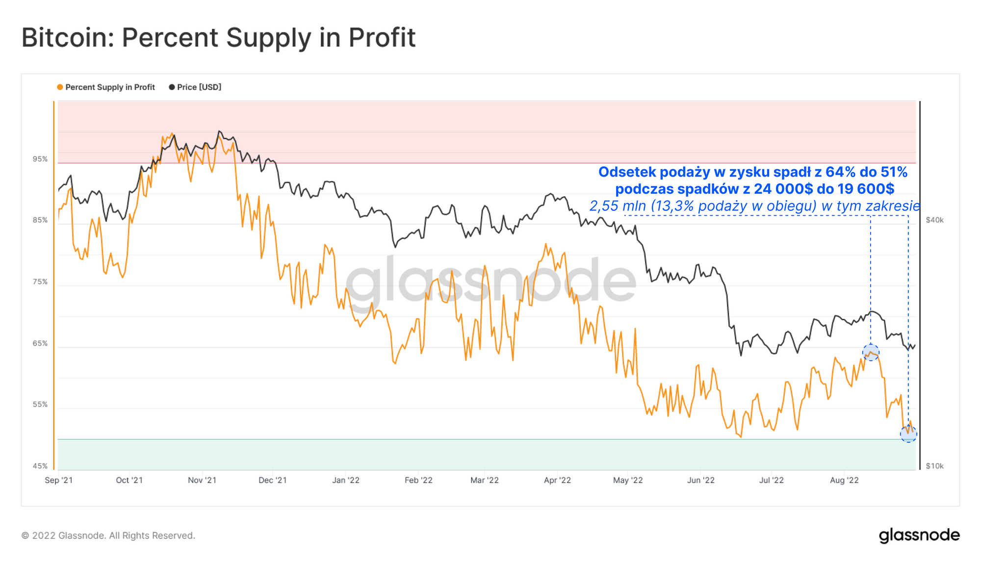 W związku z tym możemy zaobserwować, że 13,3% podaży w obiegu straciło status „zyskownej” podczas spadków z 24 000$ do 19 600$. Sugeruje to, że 2,55 mln (13,3%) podaży w obiegu zawierało ostatnio transakcje w tym przedziale cenowym.