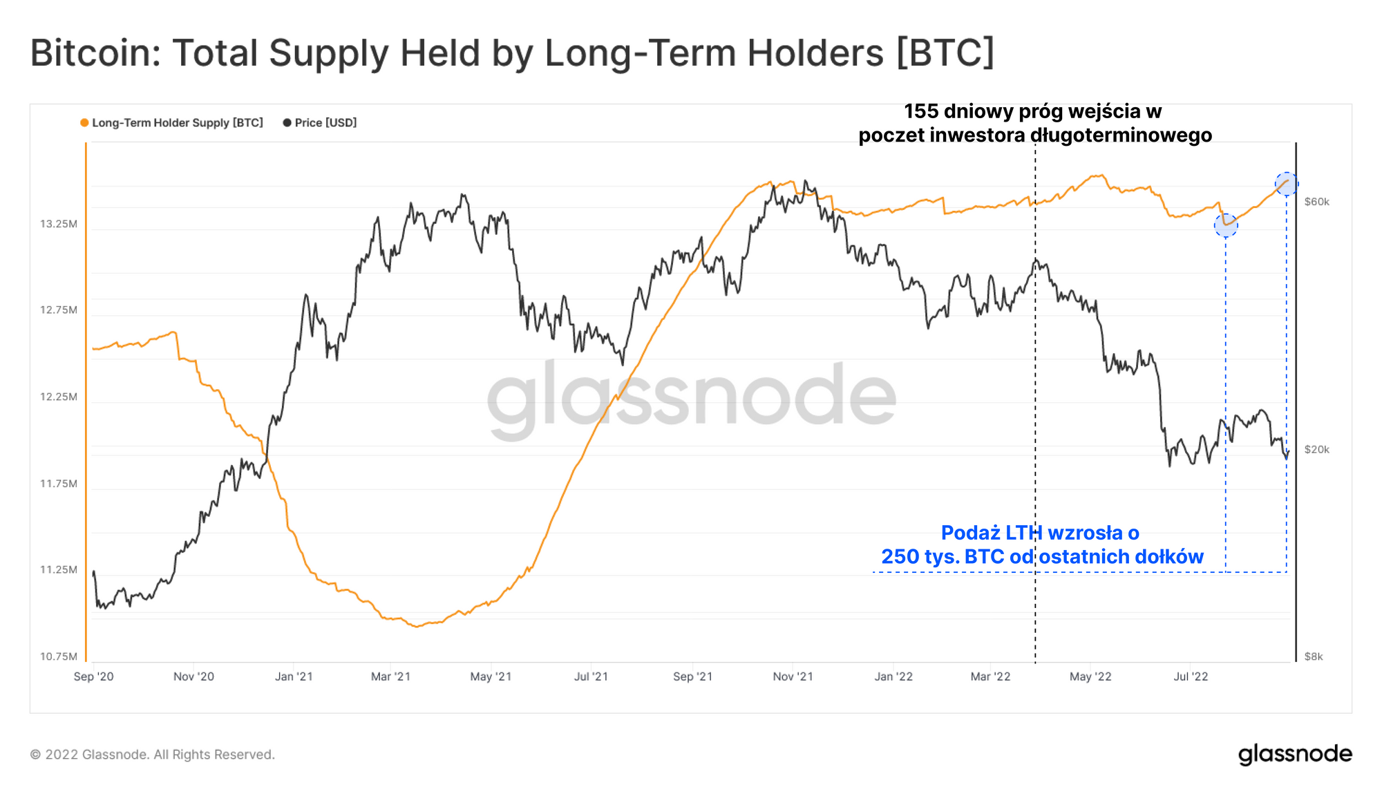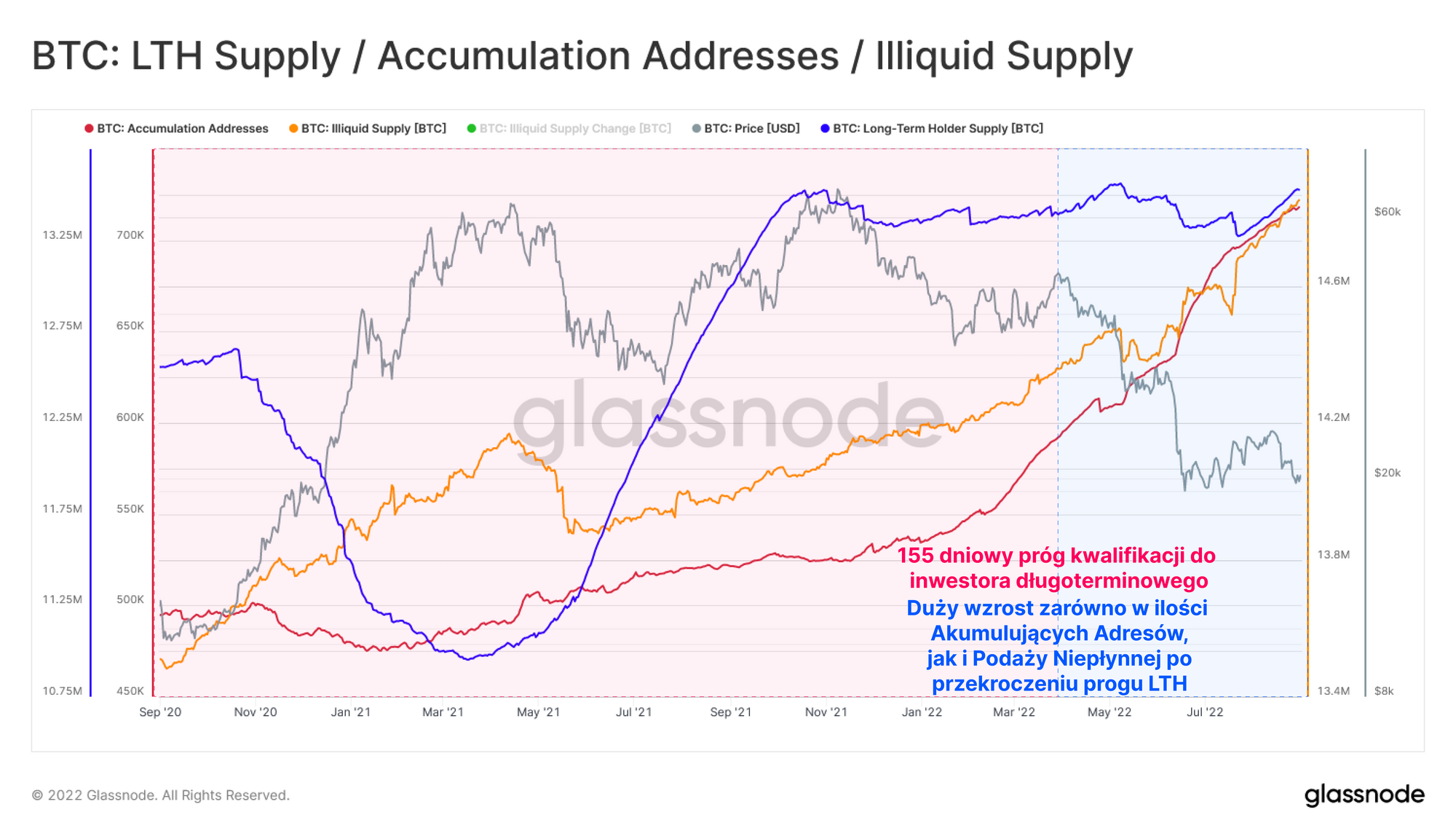 Próg przejścia z STH do LTH przedstawiono na poniższym wykresie. Zbiega się on z nagłym wzrostem zarówno ilości adresów akumulujących, jak i przyspieszeniem momentum wzrostu niepłynnej podaży. Należy również zauważyć, że od tamtej pory obydwa wskaźniki osiągają coraz to nowe rekordowe poziomy.