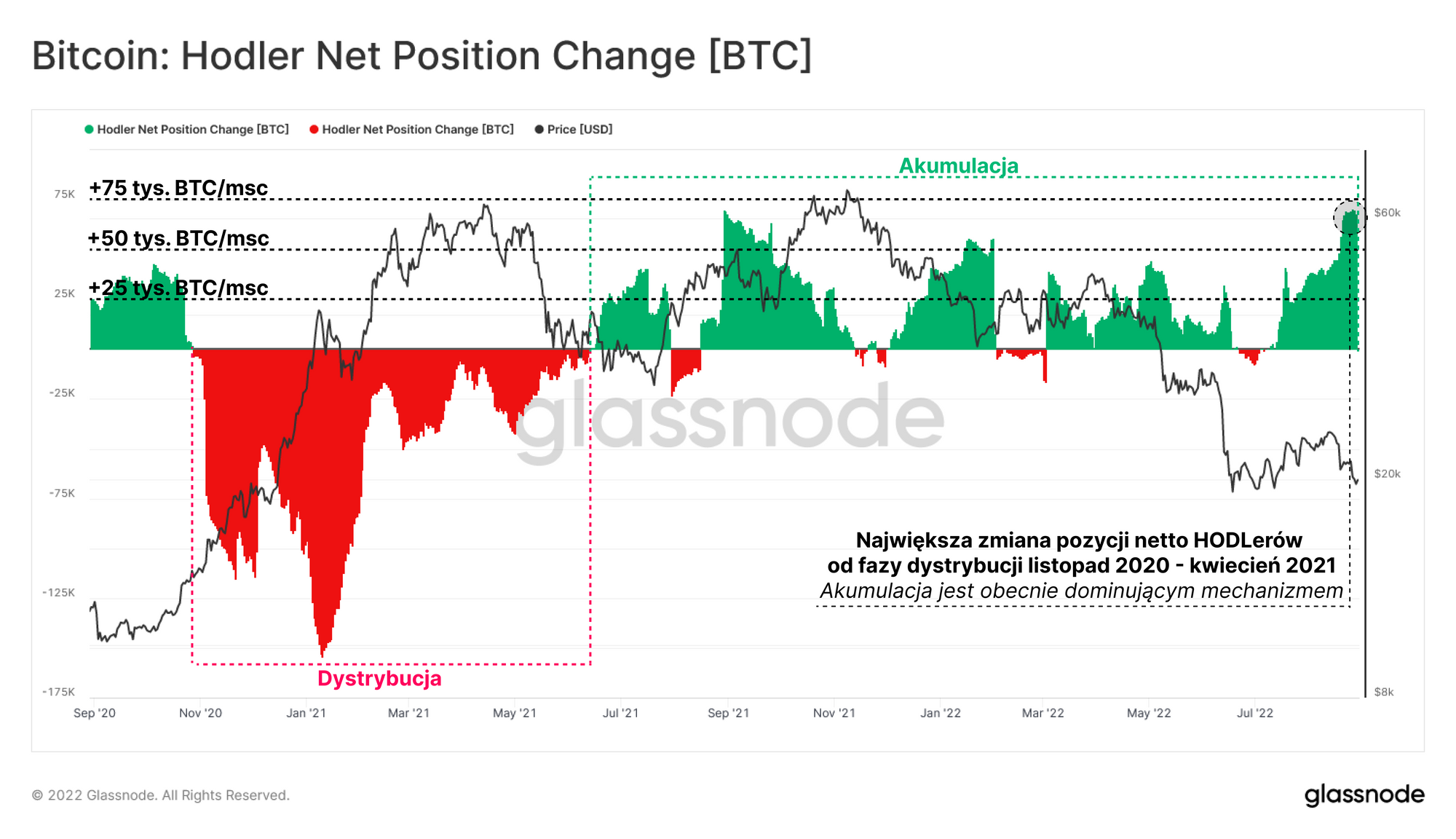 - Okres tej dystrybucji został zrównoważony przez akumulację HODLerów od drugiej połowy 2021 roku do chwili obecnej. W tym momencie obserwujemy zmianę pozycji o +70 tys. BTC miesięcznie, co stanowi największą miesięczną zmianę pozycji HODLerów od marca 2020 r.