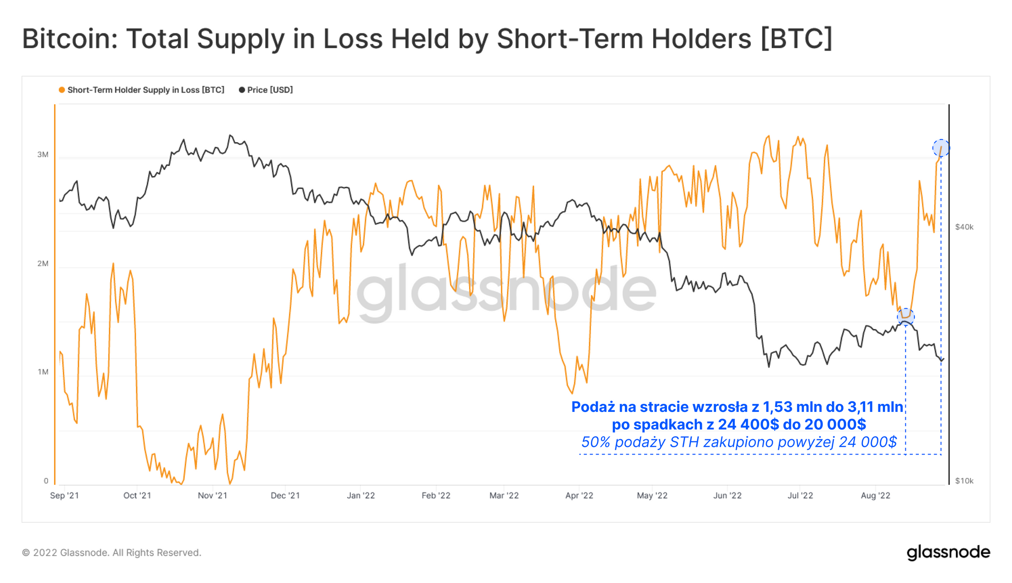 Zjawisko to powtarza się przedstawiając te dane w wartościach bezwzględnych podaży inwestorów krótkoterminowych będącej na stracie. Widzimy tutaj, że 1,53 mln posiadanych przez STH coinów spadło poniżej progu zyskowności podczas spadków z 24,4 tys. USD.