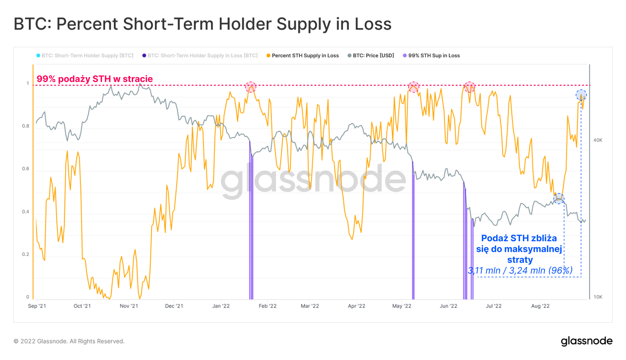 Jednak po niedawnych spadkach notowań, większość podaży STH znajduje się obecnie na niezrealizowanej stracie, co wywiera na tej grupie presję finansową.