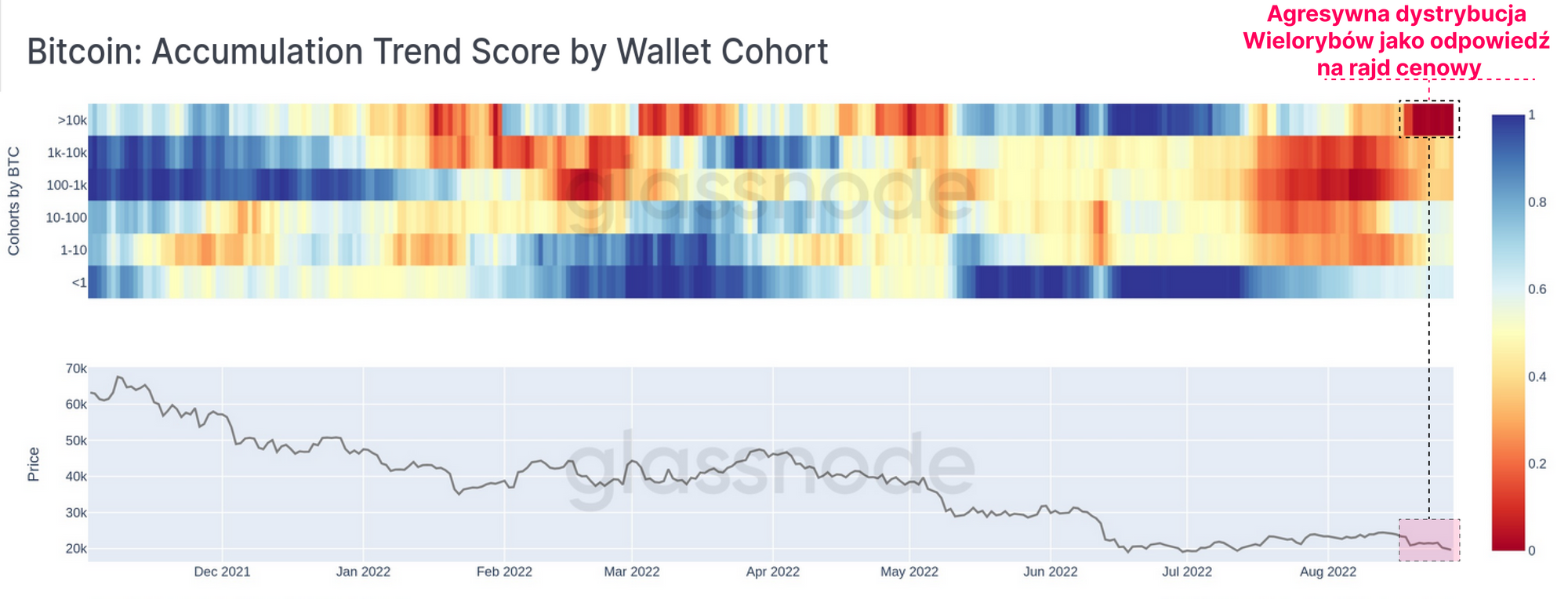 Po spadkach do 17 600$ nastąpiła silna zmiana nastawienia, gdyż transfery Wielorybów szybko zmieniły się na depozyty netto na giełdy. Szczytowa dystrybucja została osiągnięta wokół ostatniego lokalnego szczytu na poziomie 24500$. Zapewnia to zbieżność z wynikami powyższej analizy, przy czym grupa posiadaczy 10 tys.+ BTC postrzegana jest jako dominujący czynnik.