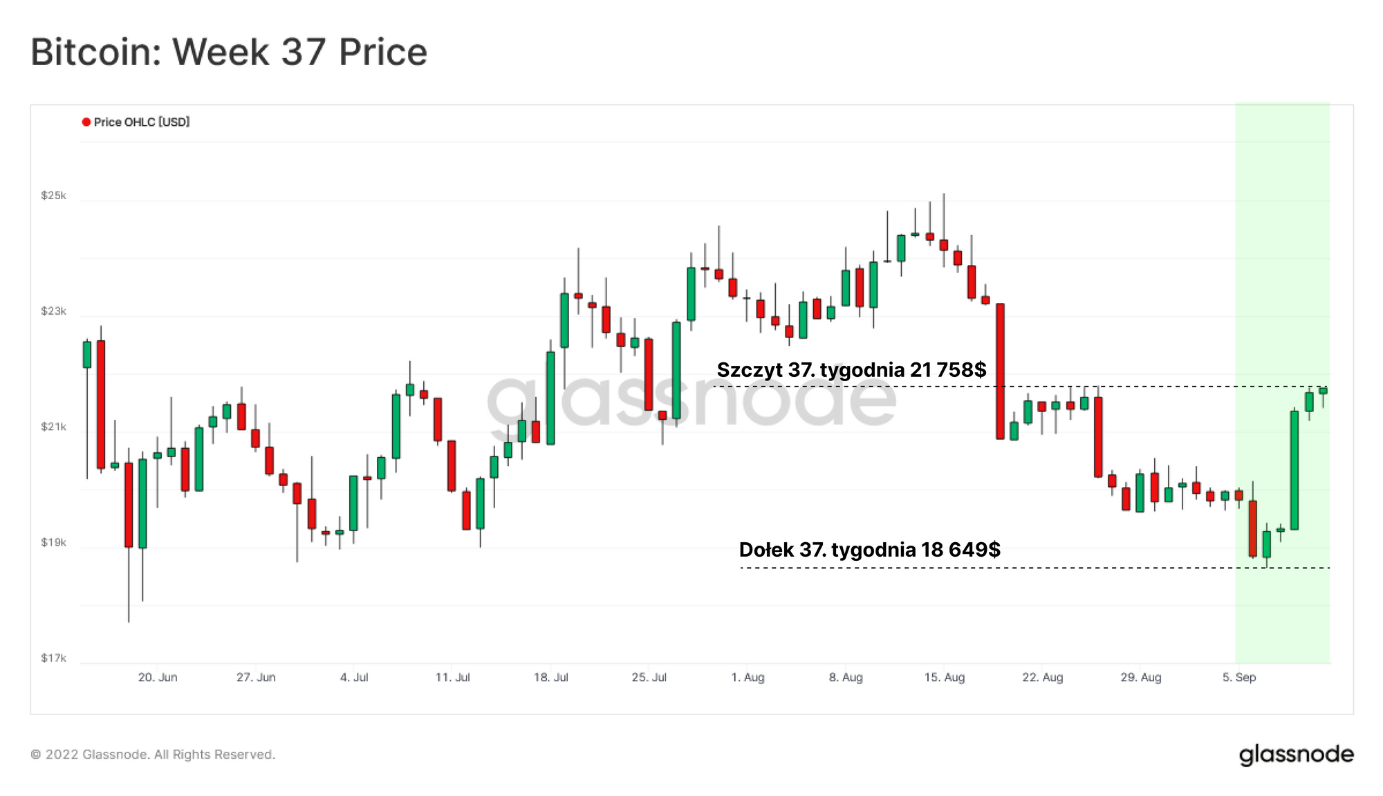 Rynek Bitcoina przeżył silny wzrost, odbijając się od drugiego najniższego dołka (18 649$) obecnego rynku bessy. Notowania poszybowały do poziomu 21 758$, ale znajdują się w istotnym przedziale konsolidacji, który obserwujemy od 3 miesięcy.