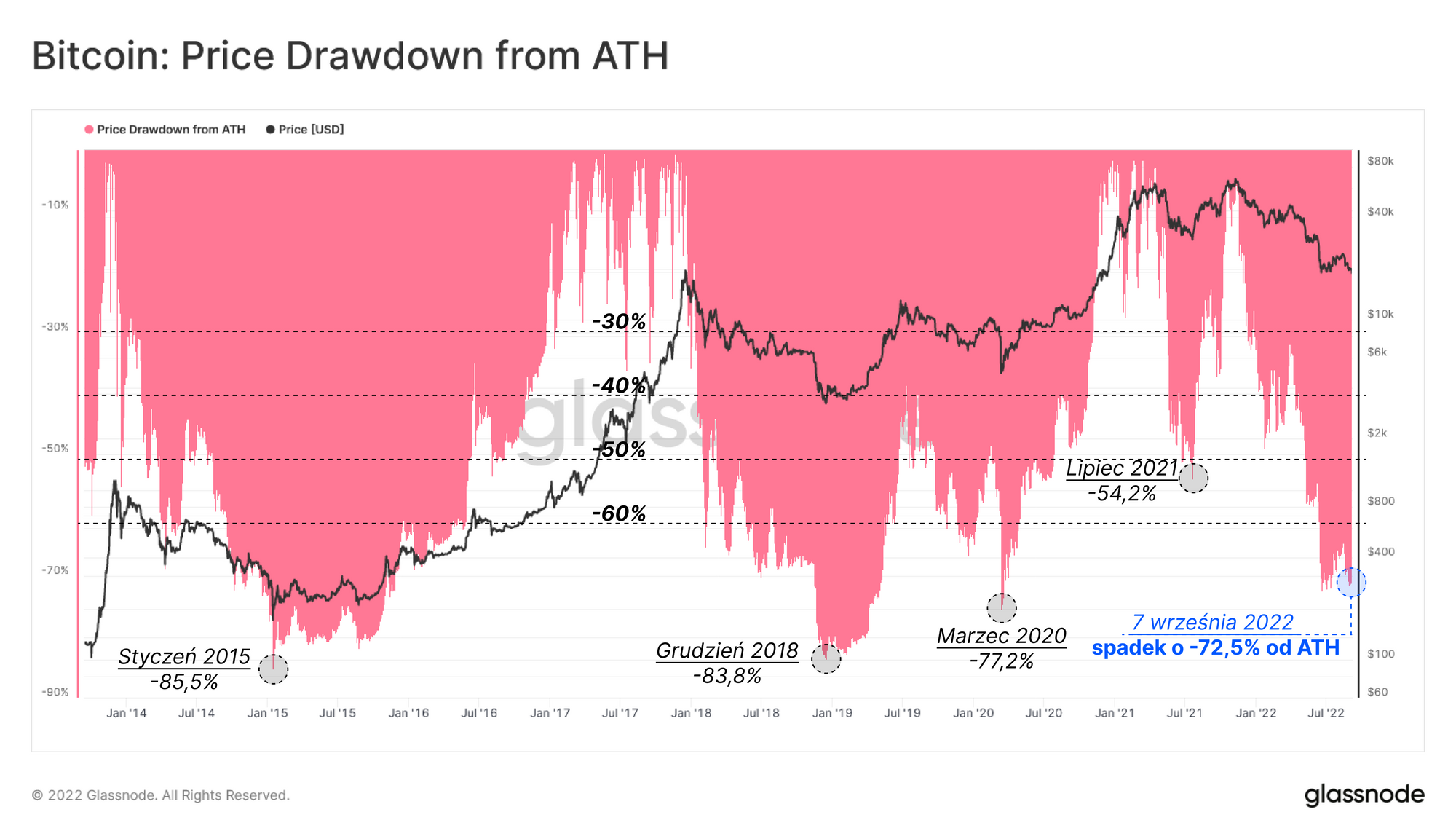 Stały trend spadkowy na Bitcoinie ma miejsce od dziesięciu miesięcy, od czasu ATH w listopadzie 2021 r. W tym tygodniu notowania spot Bitcoina osiągnęły poziom 18 649$, wyznaczając drugi najniższy lokalny dołek o 72,5% spadku względem szczytu cyklu. W porównaniu z wcześniejszymi cyklicznymi dołkami bessy, spadki w 2022 roku nie były tak znaczące pod kątem procentowych spadków. Dołki w latach 2015, 2018 i 2020 osiągały spadki o ponad 77% od ATH.