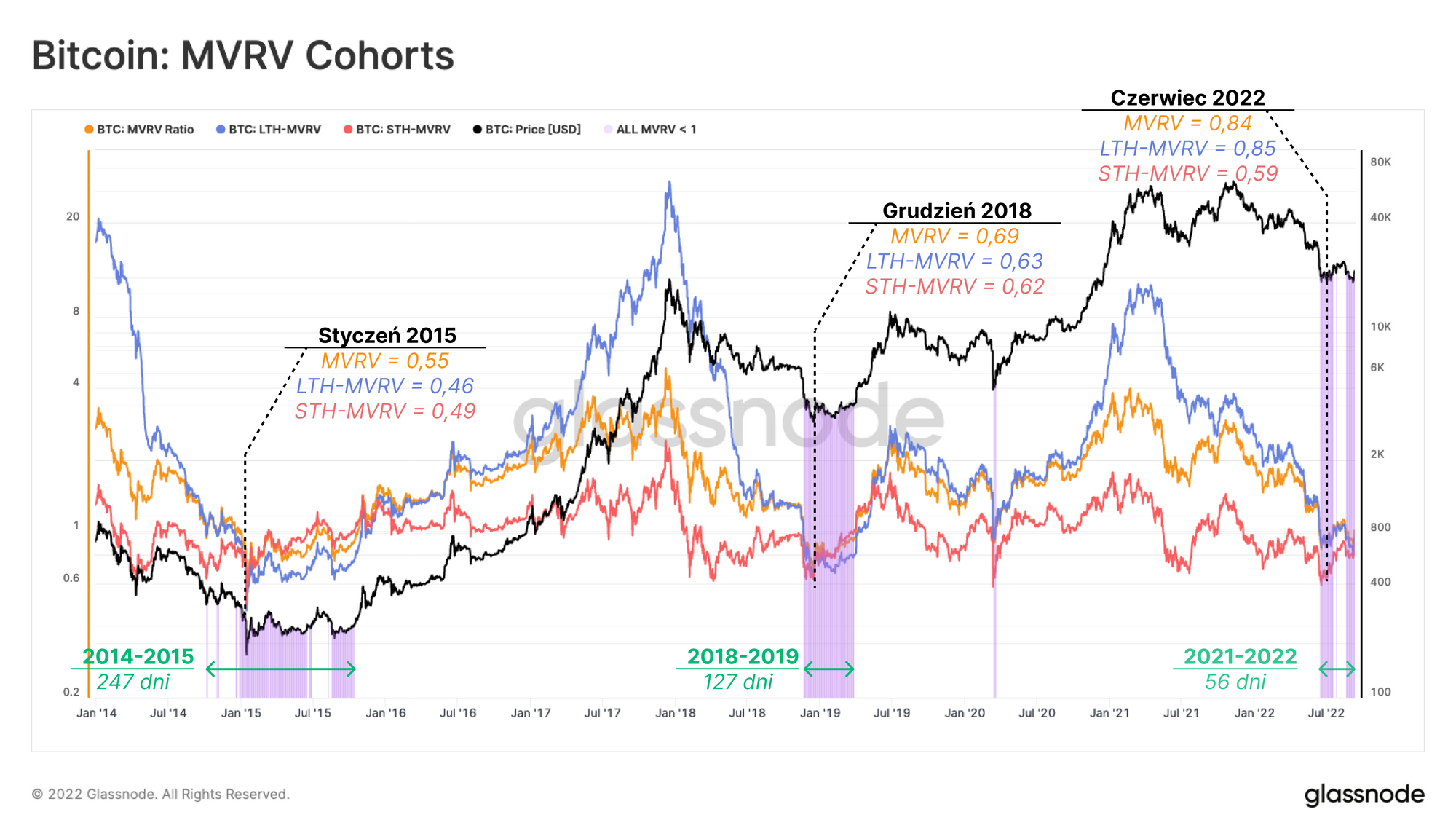 Obecna bessa znajduje się w tym stanie już 56 dni, pomimo krótkiego wybicia powyżej poziomu Realized Price i Realized Price inwestorów długoterminowych. W porównaniu z typowym dla poprzednich bess czasem tkwienia notowań poniżej poziomu Realized Price (~190 dni), 56 dni pozostaje stosunkowo krótkim okresem.