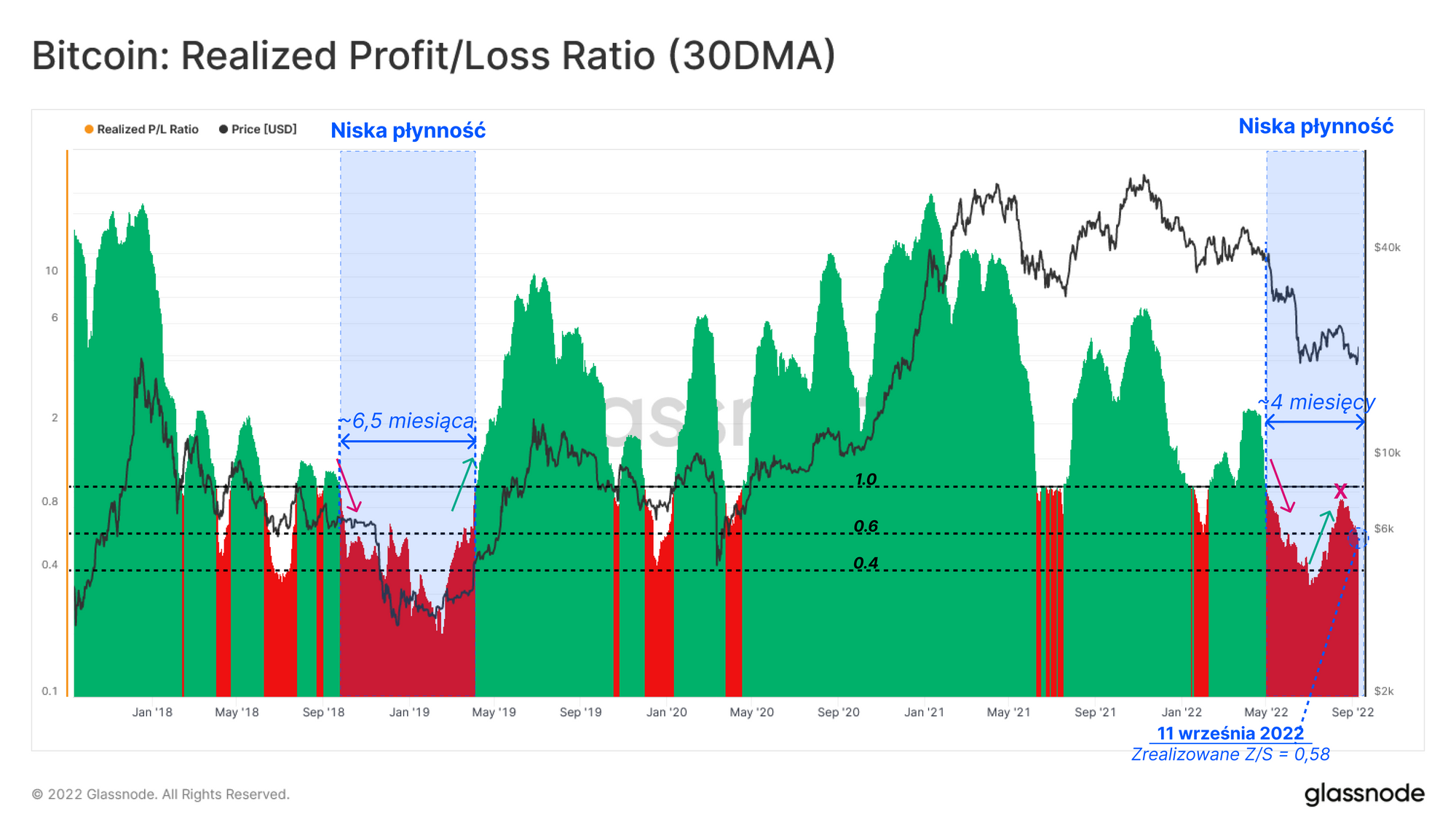 Okres między spadkiem poniżej poziomu 1,0 i jego odzyskaniem jest czasem, w którym niedźwiedzi sentyment jest najsilniejszy, także z powodu niewystarczającej płynności popytu. Obecny okres niskiej płynności rozpoczął się około 4 miesiące temu i można go porównać z 6-cio miesięcznym okresem podczas bessy w 2018-2019 roku.