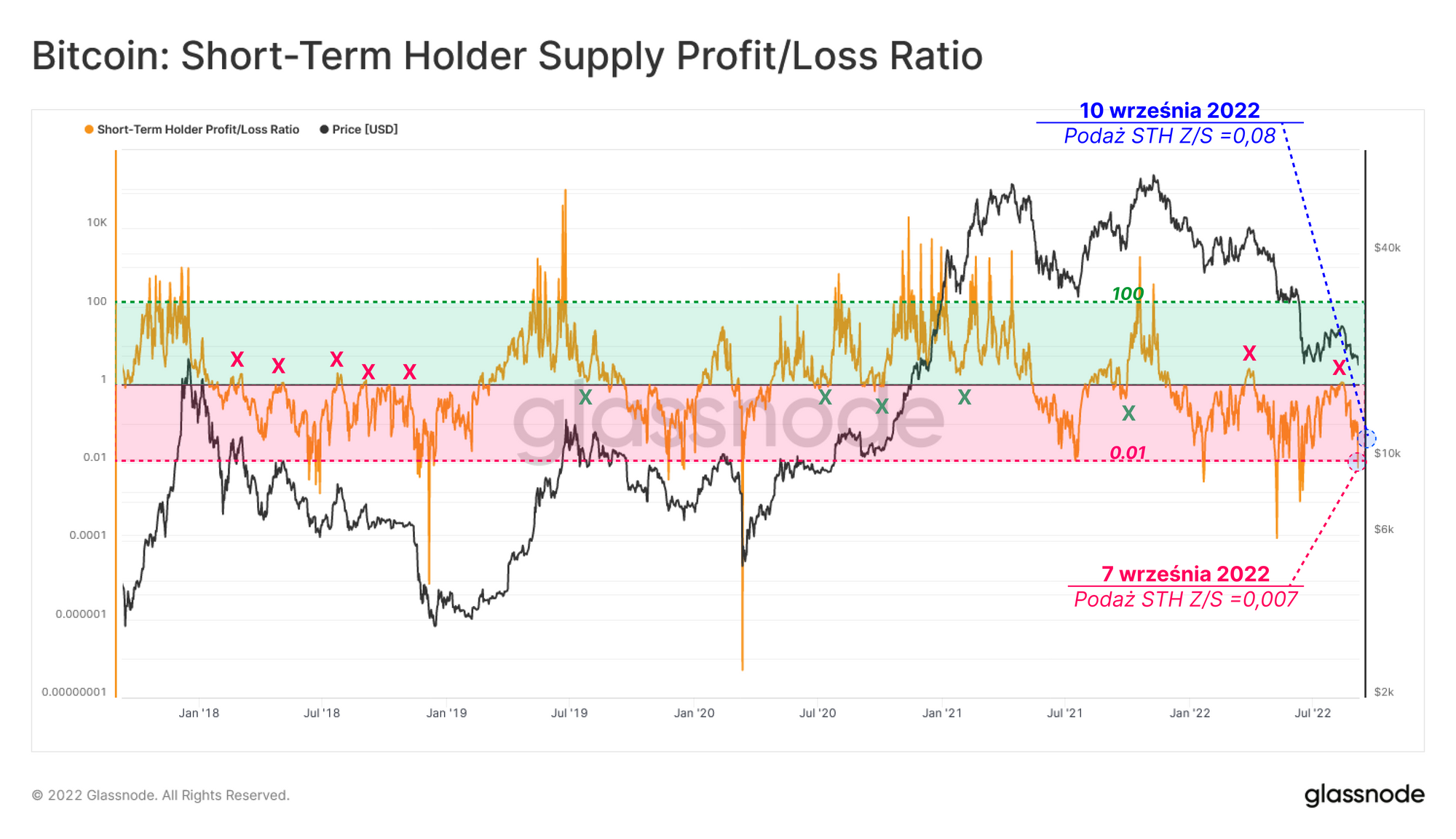 Przedstawiony do tej pory obraz podkreśla istotną rolę zachowania inwestorów krótkoterminowych w ostatnich ruchach notowań. Dlatego mając na uwadze ich strategiczną rolę, ocena wyprzedawania się STH ma kluczowe znaczenie dla identyfikacji solidnego dna na rynku. Podstawowym narzędziem do badania rentowności inwestorów krótkoterminowych jest Short-Term Holder SOPR, wskazujące średnią wielokrotność zysku na sprzedanych coinach.