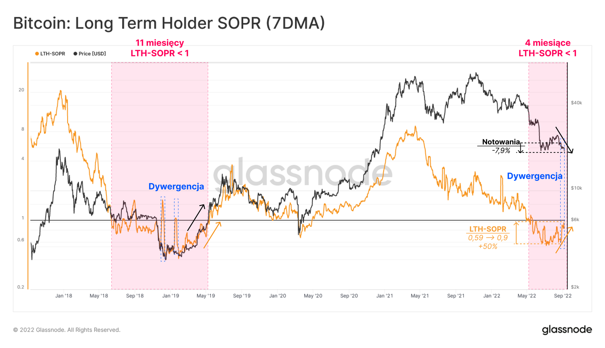 Wyprzedaż z czerwca 2022 roku ma wiele podobieństw do fazy C, a ostatnie odrzucenie poziomu 24 000$ pokazało przekonujący re-test od dołu poziomu STH-SOPR = 1,0, pokazując, że inwestorzy sprzedawali coiny po swoim koszcie bazowym. Takie odrzucenia są typowymi formacjami na rynku podczas bessy.