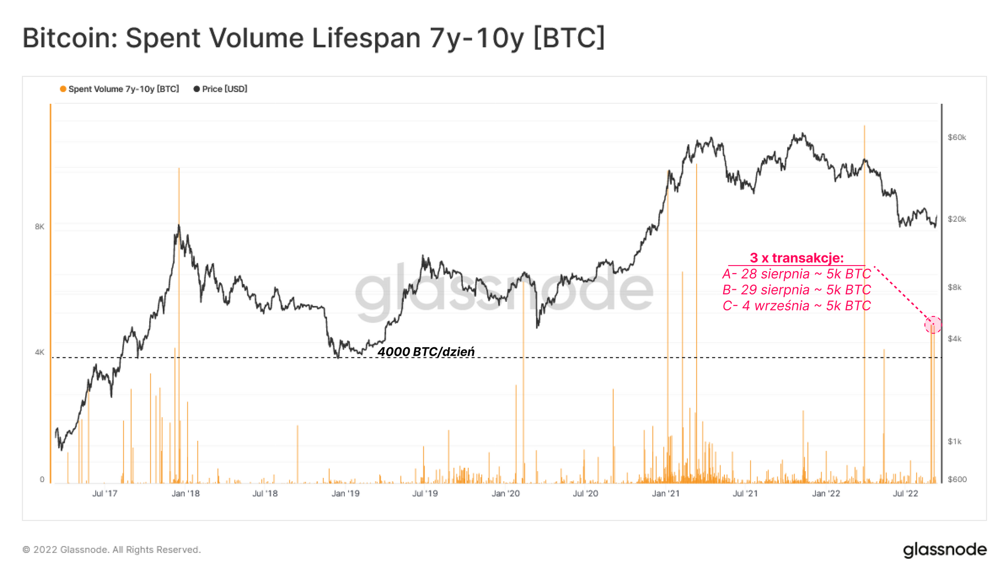 - A- Blok nr 751518, 28 sierpnia 2022 (19 600$), Sprzedano 5000 BTC (1500 BTC przelano do nieznanego odbiorcy i 3500 BTC na giełdę Kraken), pierwotna data zakupu: 19 grudnia 2013 r. (543,14$)