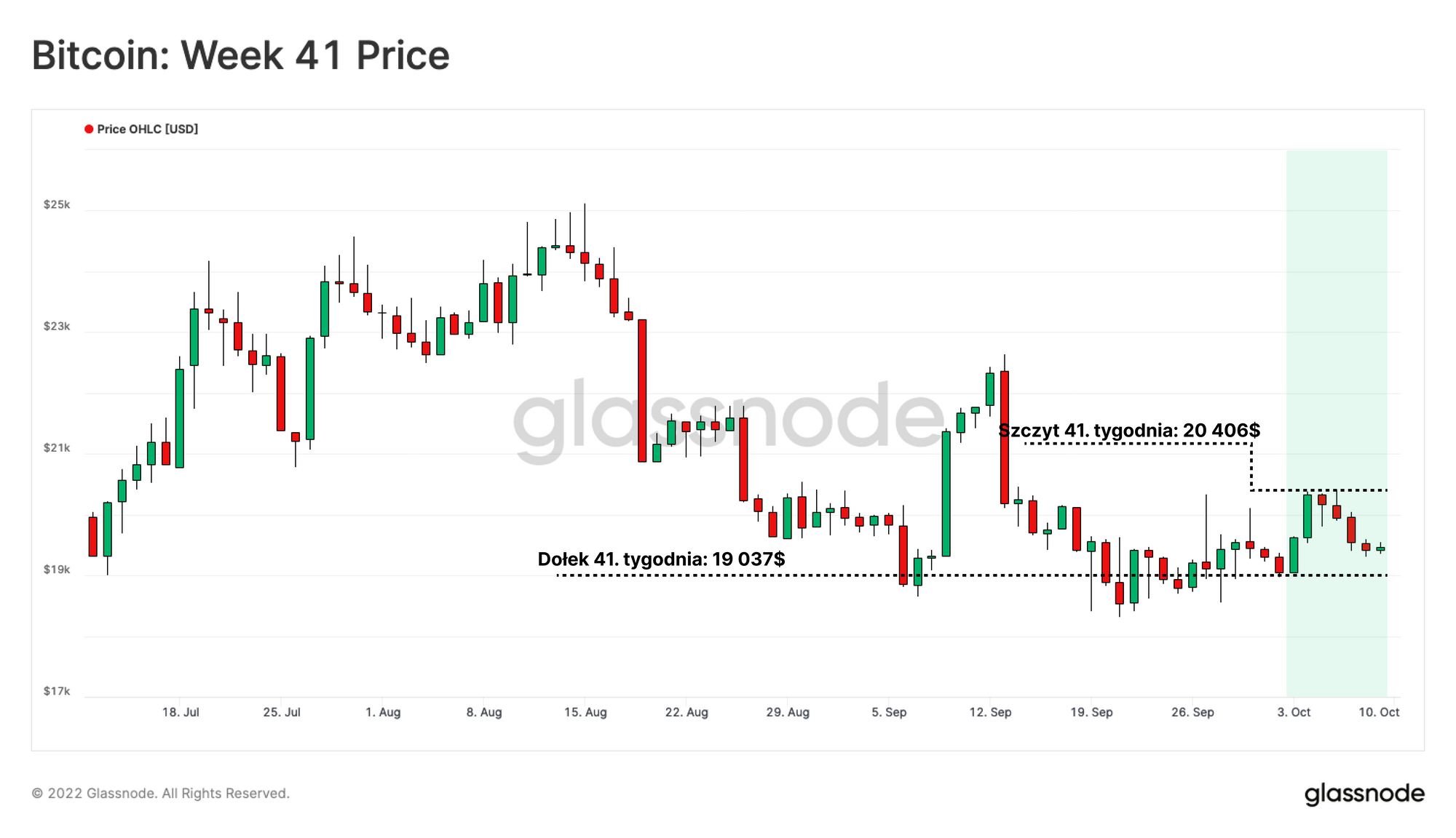 Rynek Bitcoina notował w tym tygodniu nieco wyższe ceny, wzrastając z najniższego poziomu 19 037$ do najwyższego poziomu 20 406$. Ceny poruszają się w ograniczonym zakresie, konsolidując już od ponad 120 dni od kluczowego wydarzenia związanego z delewarowaniem rynku w połowie czerwca.