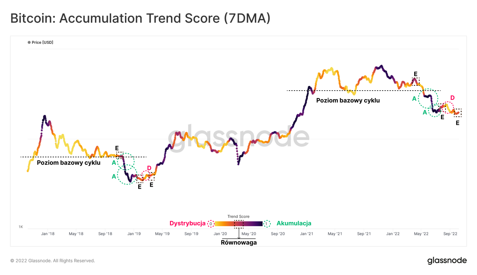 Co ciekawe, po przebiciu obecnego poziomu bazowego cyklu na poziomie 30 tys. USD, miała miejsce seria następujących po sobie wydarzeń podobnych do bessy w latach 2018-2019. W trakcie kapitulacji na początku 2022 r. Wskaźnik Trendu Akumulacji wskazuje, że miała miejsce znaczna akumulacja ze strony dużych podmiotów, a także zastopowanie niedawnego rajdu bessy do 24 500$. Obecnie wskaźnik ten sugeruje równowagę (neutralną strukturę) na rynku, podobną do tej na początku 2019 roku.