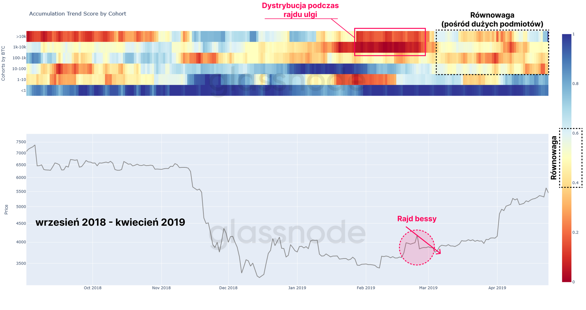 Widzimy, że duże podmioty, w szczególności portfele od 1 tys. do 10 tys. BTC, przyczyniły się do dystrybucji 🟥 – podczas rajdu z dołków w marcu 2019 r., a następnie weszły w okres równowagi. Mali, detaliczni uczestnicy (< 1 BTC) utrzymywali dużą akumulację 🟦 przez cały 2018 i 2019 rok.