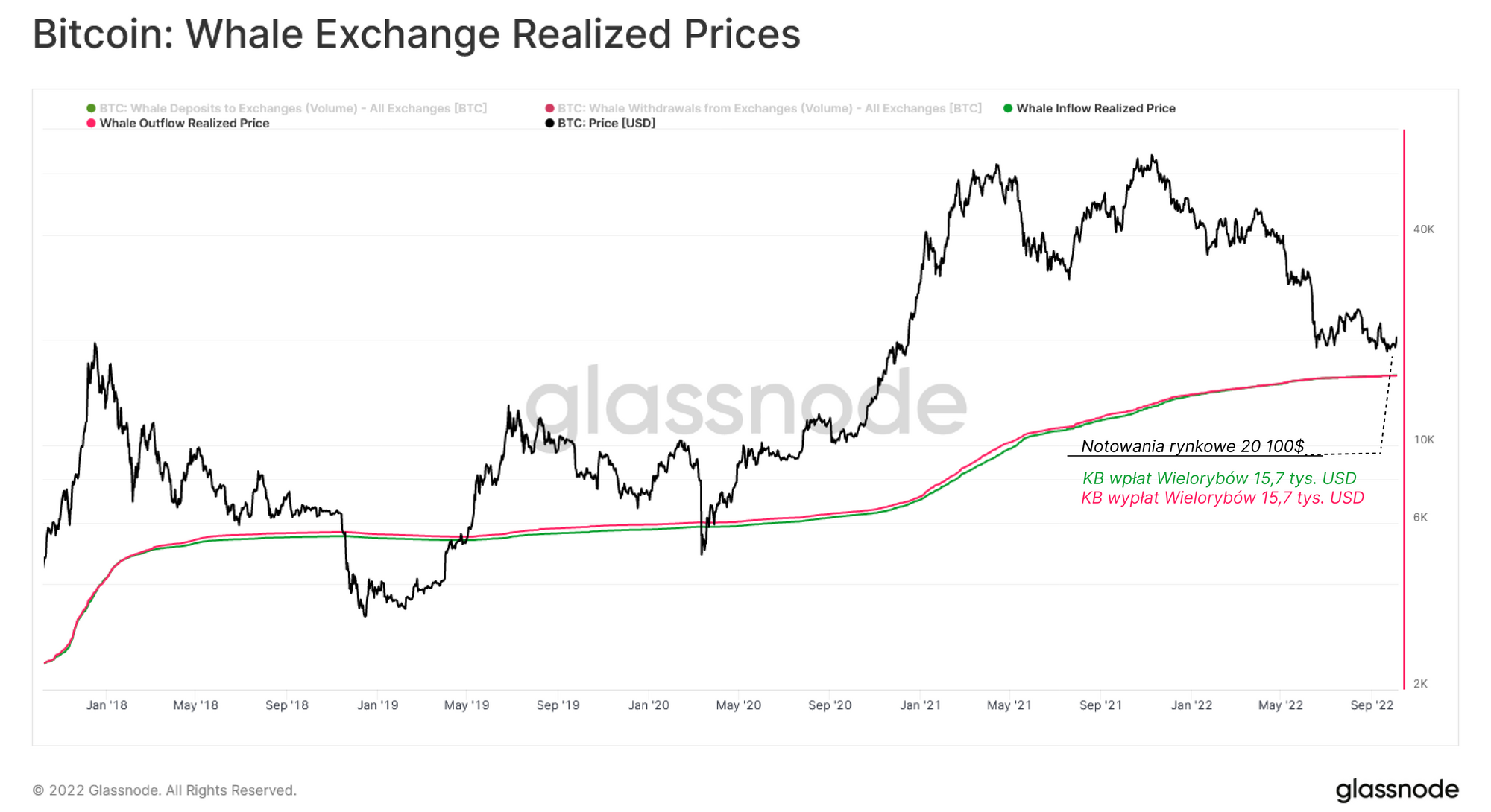 Możemy obliczyć koszt bazowy wszystkich Wielorybów aktywnie spekulujących w danym okresie czasu i może to dać nam poziom progowy, który jest psychologicznie ważny dla tego typu inwestorów. Poprzez oznaczanie cen wpłat i wypłat dla wielorybów (1 tys.+ BTC) do/z giełd, możemy oszacować średnią cenę wpłat/wypłat Wielorybów od stycznia 2017 r. Ten koszt bazowy Wielorybów wynosi obecnie około 15 800$.