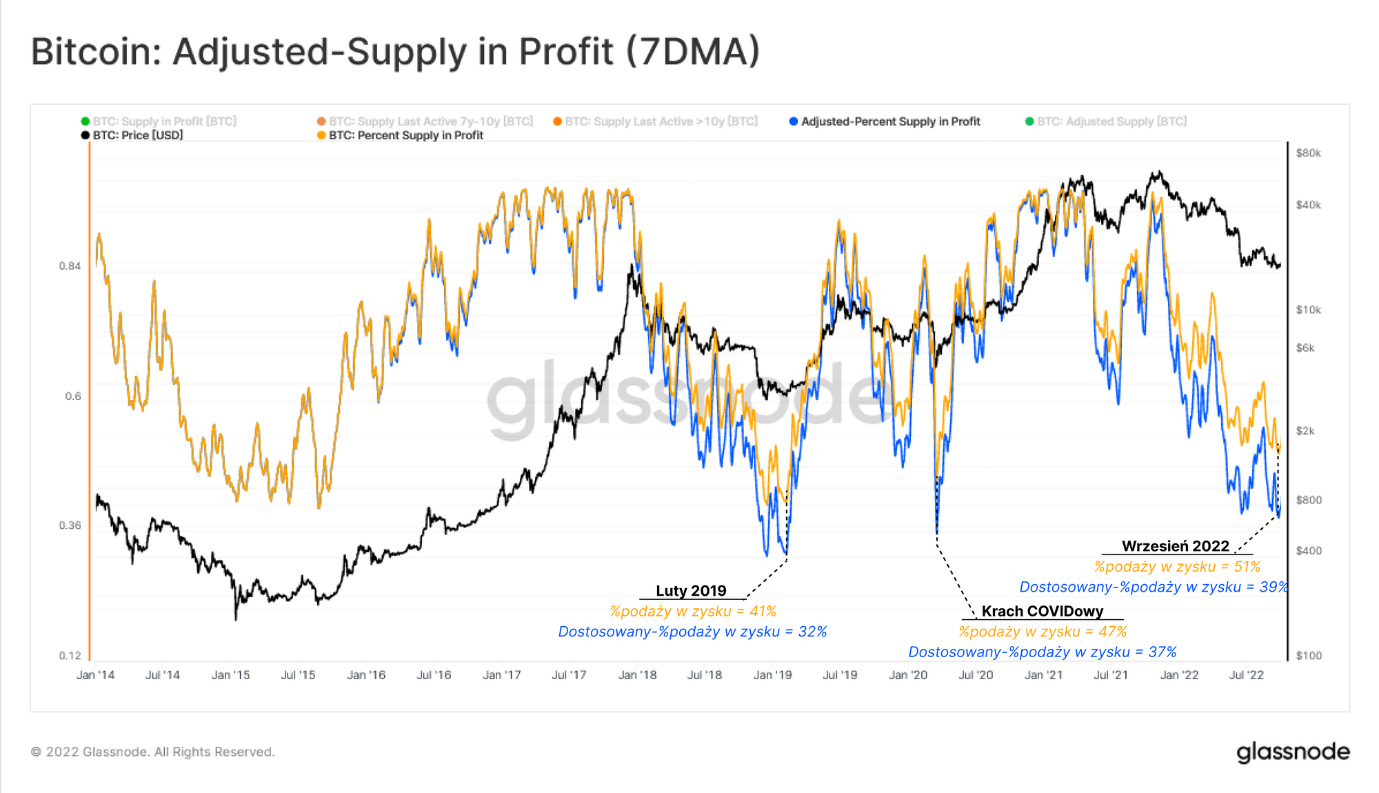 Odejmując od podaży w zysku 🟠 nieaktywną podaż, możemy obliczyć skorygowany odsetek podaży w zysku 🔵. Uzyskany w ten sposób wykres pokazuje, że w najniższym punkcie danego cyklu dostosowany odsetek podaży w zysku tendencję do spadku do około 39%, jednak z podobnym wnioskiem - w poprzednich cyklach było gorzej.