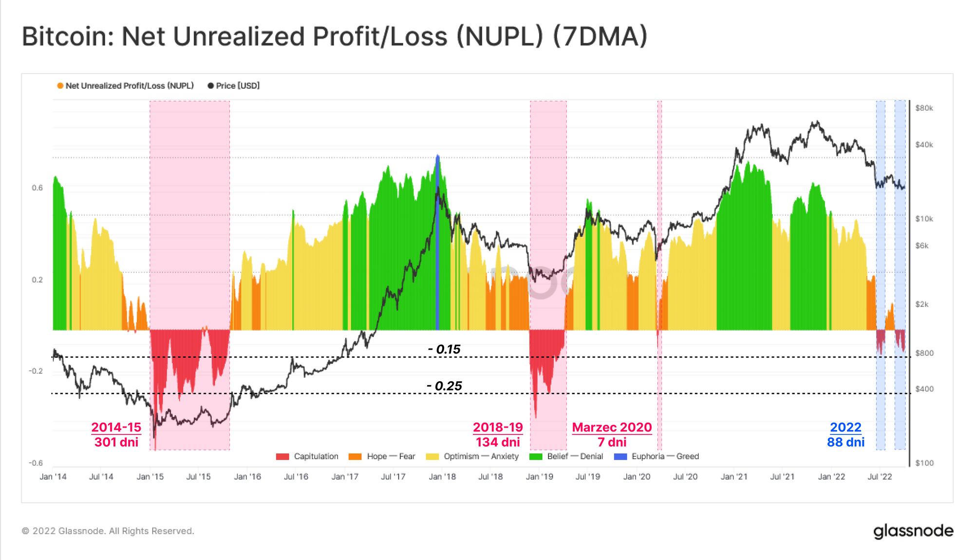 Od początku czerwca NUPL spadał dwukrotnie do skompresowanego i ujemnego zakresu od 0% do -15%, spędzając tam do tej pory łącznie 88 dni. Z perspektywy porównawczej NUPL spadał do poziomów niższych niż -25% w poprzednich cyklach i pozostawał ujemny przez okres od 134 dni (2018-19) do 301 dni (2014-15).
