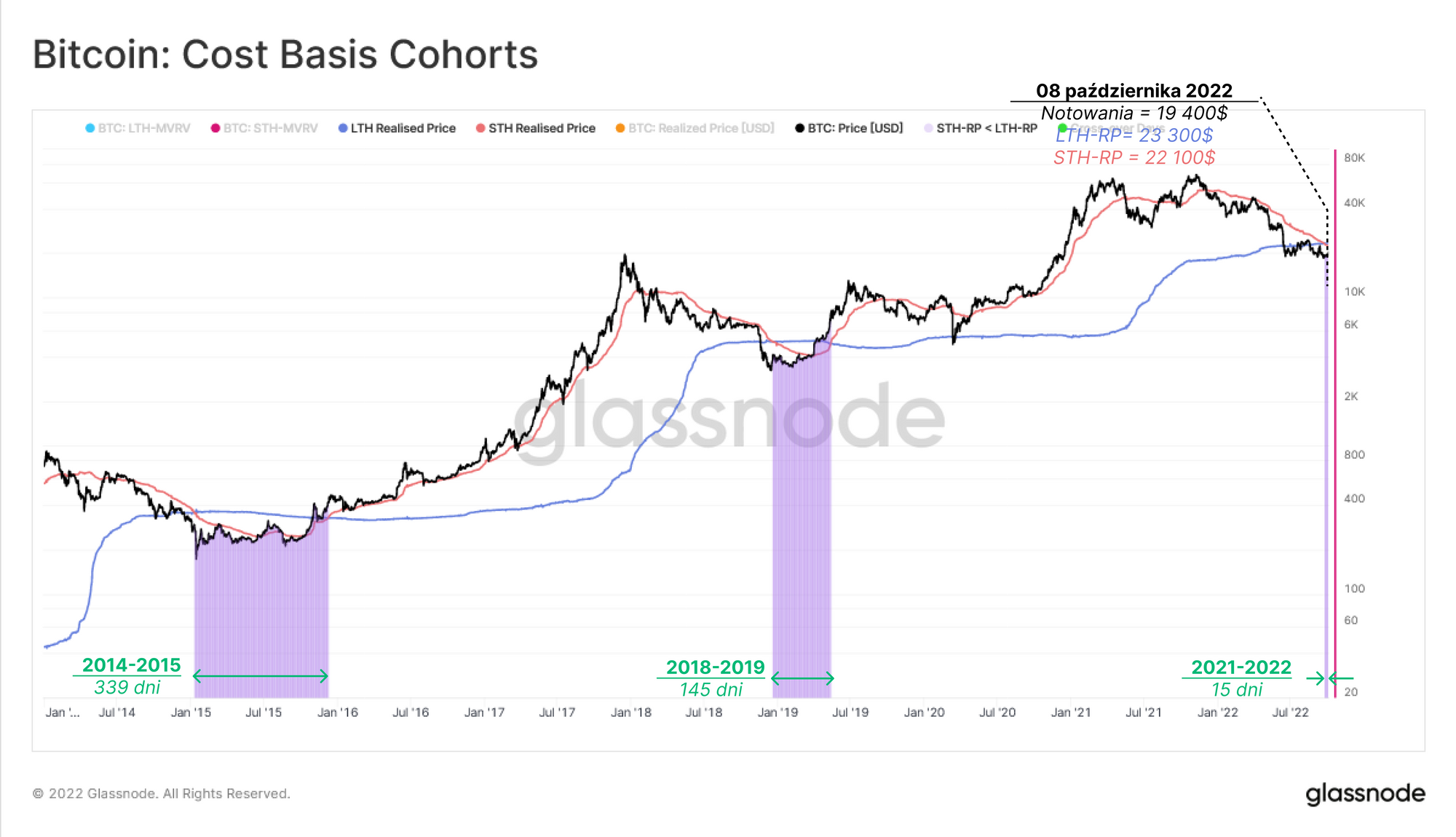 Dwa tygodnie temu rynek ponownie wkroczył w ten etap i w odniesieniu do poprzednich bess, poprawa sytuacji rynkowej trwała od 145 do 339 dni. Koszt bazowy LTH wynosi 23 300$, a STH 22 100$. Wyznacza to kluczową strefę cenową, w której początkowo można oczekiwać oporu, ale następnie potencjalnie wsparcia, jeśli notowania wykroczą poza ten obszar.