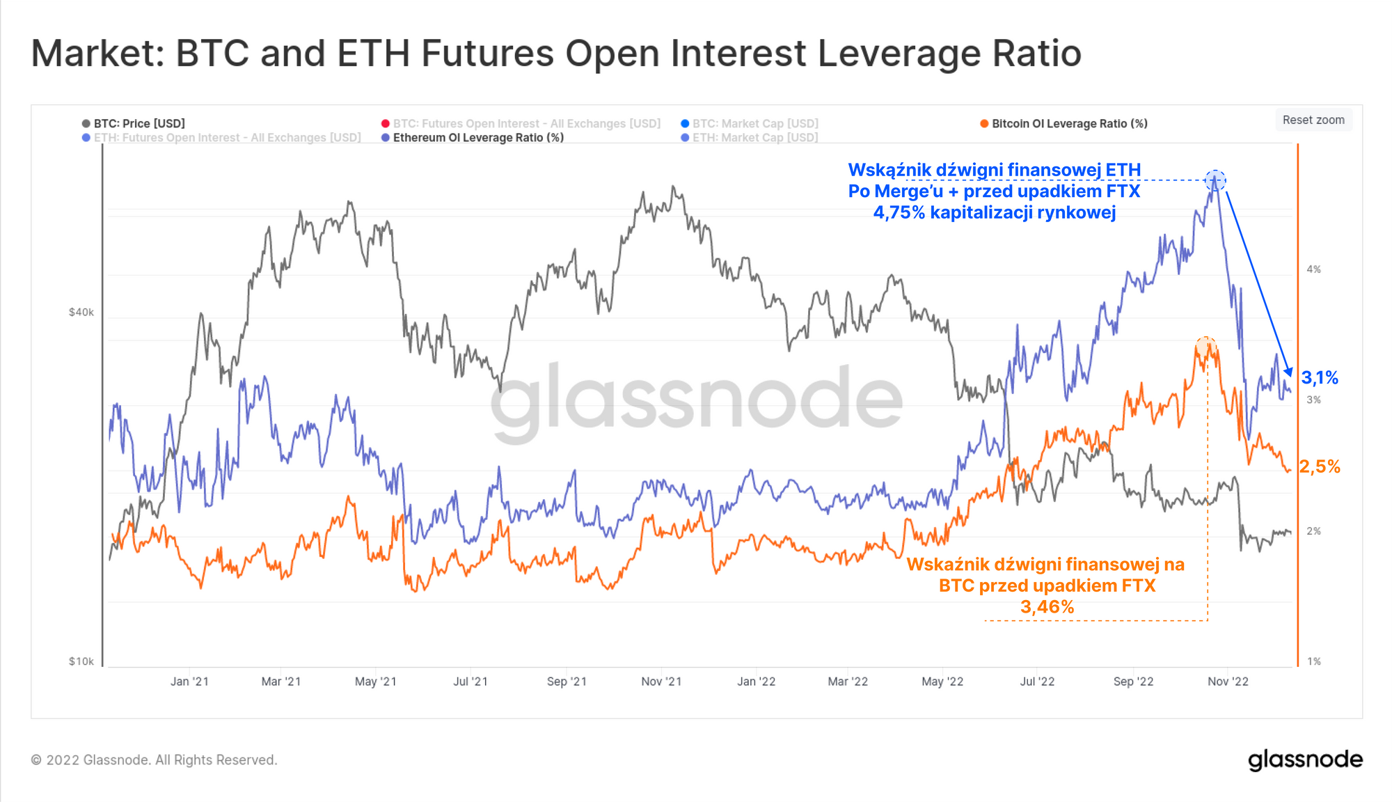 Wzrost, a następnie spadek kontraktów futures w listopadzie był znacznie bardziej dotkliwy na rynku ETH, prawdopodobnie w wyniku zamykania pozostałych transakcji związanych z Merge. Wartość otwartych kontraktów na ETH spadła z 4,75% do 3,10% kapitalizacji rynkowej. Wskaźnik Dźwigni Finansowej na BTC osiągnął szczyt tydzień przed odpowiadającym szczytem na ETH i od tego czasu spadł z 3,46% do 2,50% kapitalizacji rynkowej w ciągu ostatniego miesiąca.