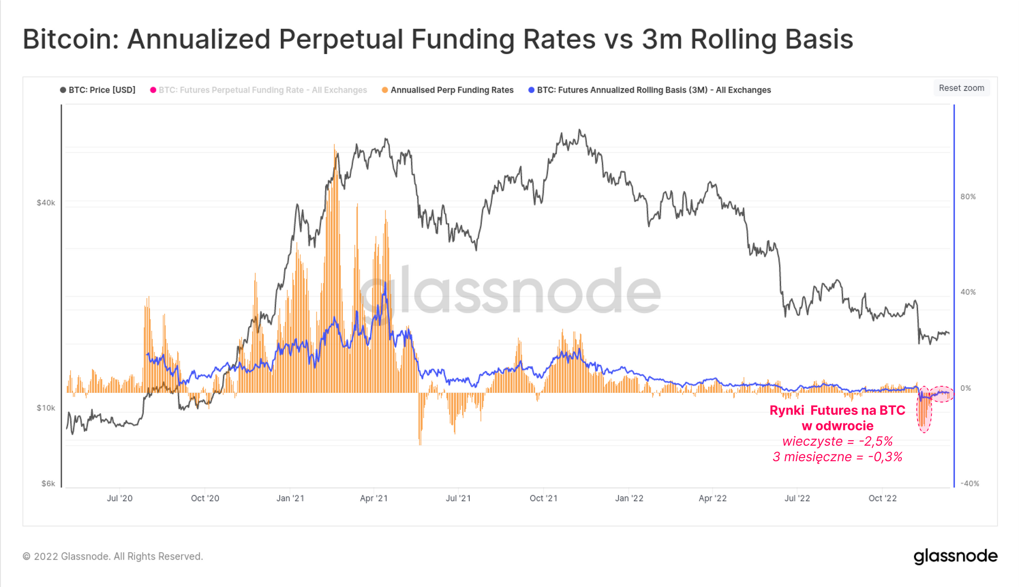 Wolumeny kontraktów Futures są na podobnie niskim poziomie, obecnie testując wieloletnie minima. Wolumeny zarówno rynku BTC, jak i ETH są obecnie bardzo podobne i wynoszą od 9,5 mld USD do 10,5 mld USD dziennie. Pokazuje to ogromny wpływ zmniejszającej się płynności, szerokiego delewarowania rynku oraz osłabienia wielu działów pożyczkowych i handlowych tej branży.