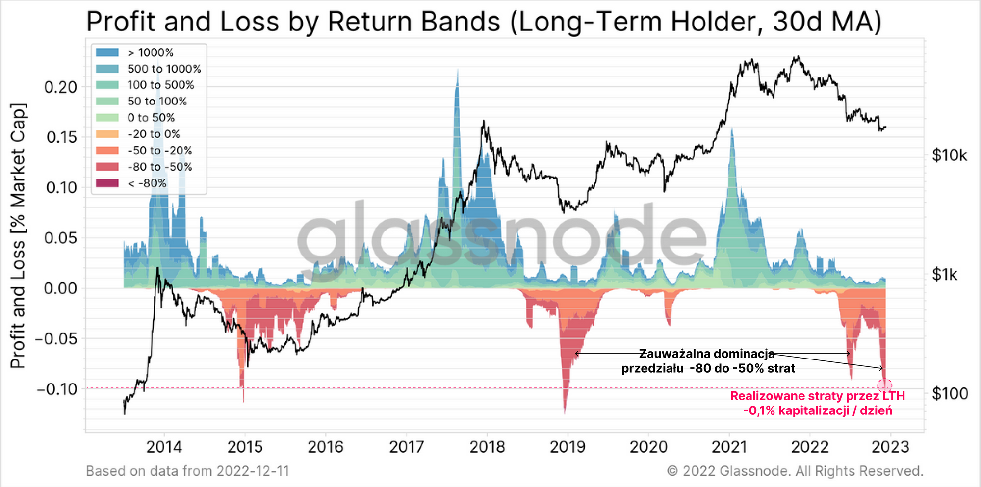 W tym wszystkim godnym uwagi jest udział inwestorów długoterminowych, którzy w tym cyklu odnotowali dwa największe względne skoki strat w historii. W listopadzie dzienne straty LTH osiągnęły wartość szczytową -0,10% kapitalizacji rynkowej, porównywalną pod względem skali tylko do dołków cyklu z 2015 i 2018 roku. Spadki w czerwcu są podobnie imponujące i realizowane wtedy straty wynoszą -0,09% kapitalizacji rynkowej dziennie, z dużą dominacją LTH realizujących straty od -50% do -80% wartości początkowej inwestycji.