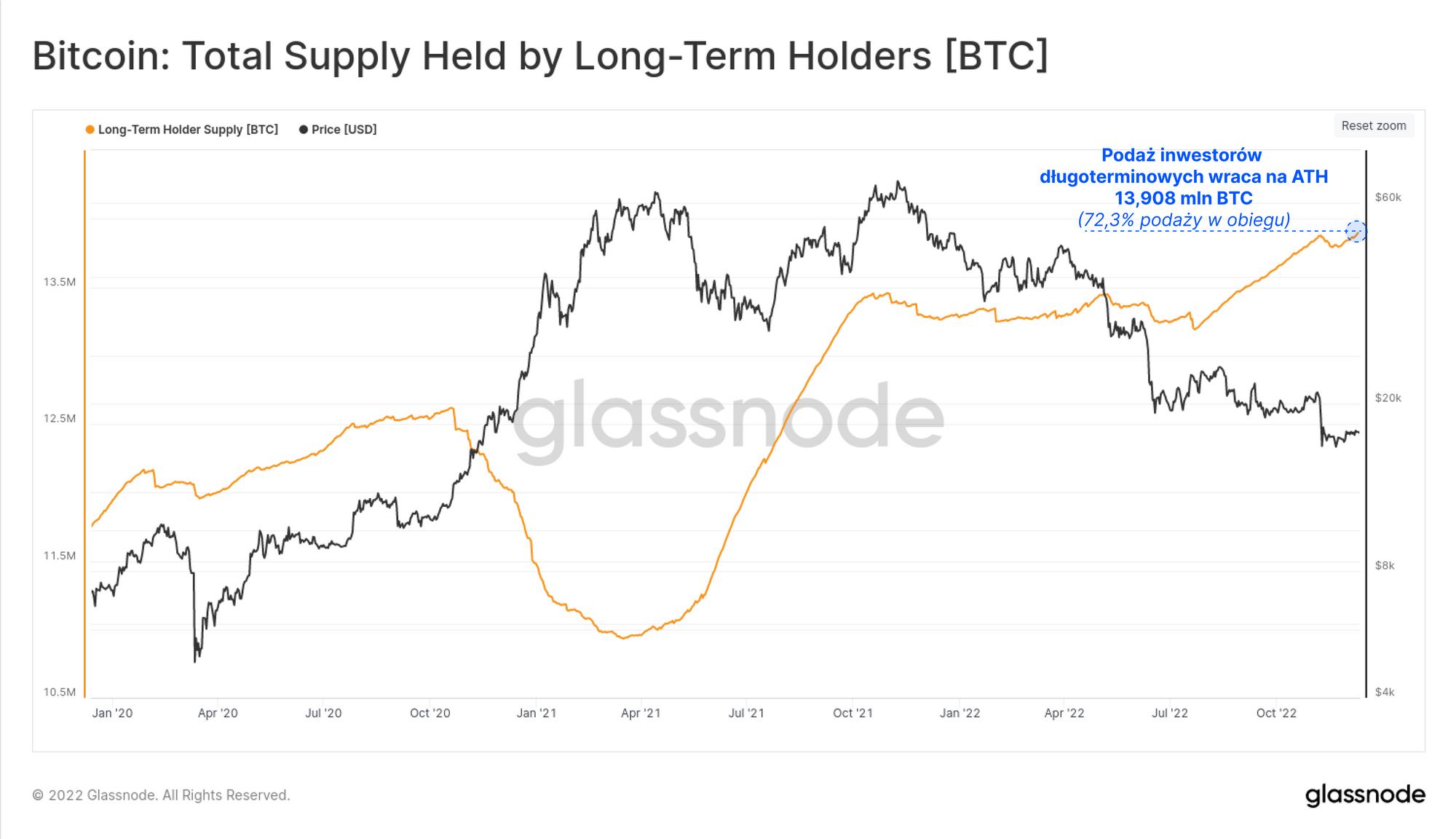 Pomimo tak spektakularnie dużych strat, wiek podaży i skłonność do HODLingu przez inwestorów, którzy pozostali, wciąż rośnie. Podaż inwestorów długoterminowych całkowicie odwróciła paniczne sprzedaże po upadku FTX, osiągając nowe ATH w wysokości 13,908 mln BTC (72,3% podaży w obiegu).