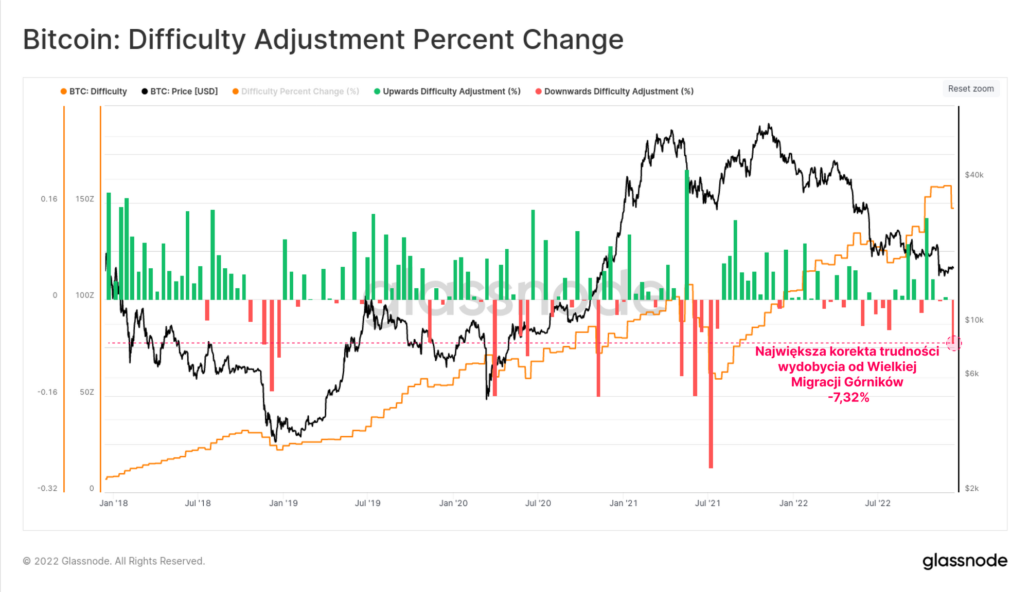 W zeszłym tygodniu nastąpiła największa korekta trudności wydobycia od czasu Wielkiej Migracji Górników w lipcu 2021. Trudność wydobycia spadła o 7,32%, co oznacza, że dość duża część aktywnego hashrate została wyłączona, prawdopodobnie w wyniku utrzymującego się stresu dochodowego.