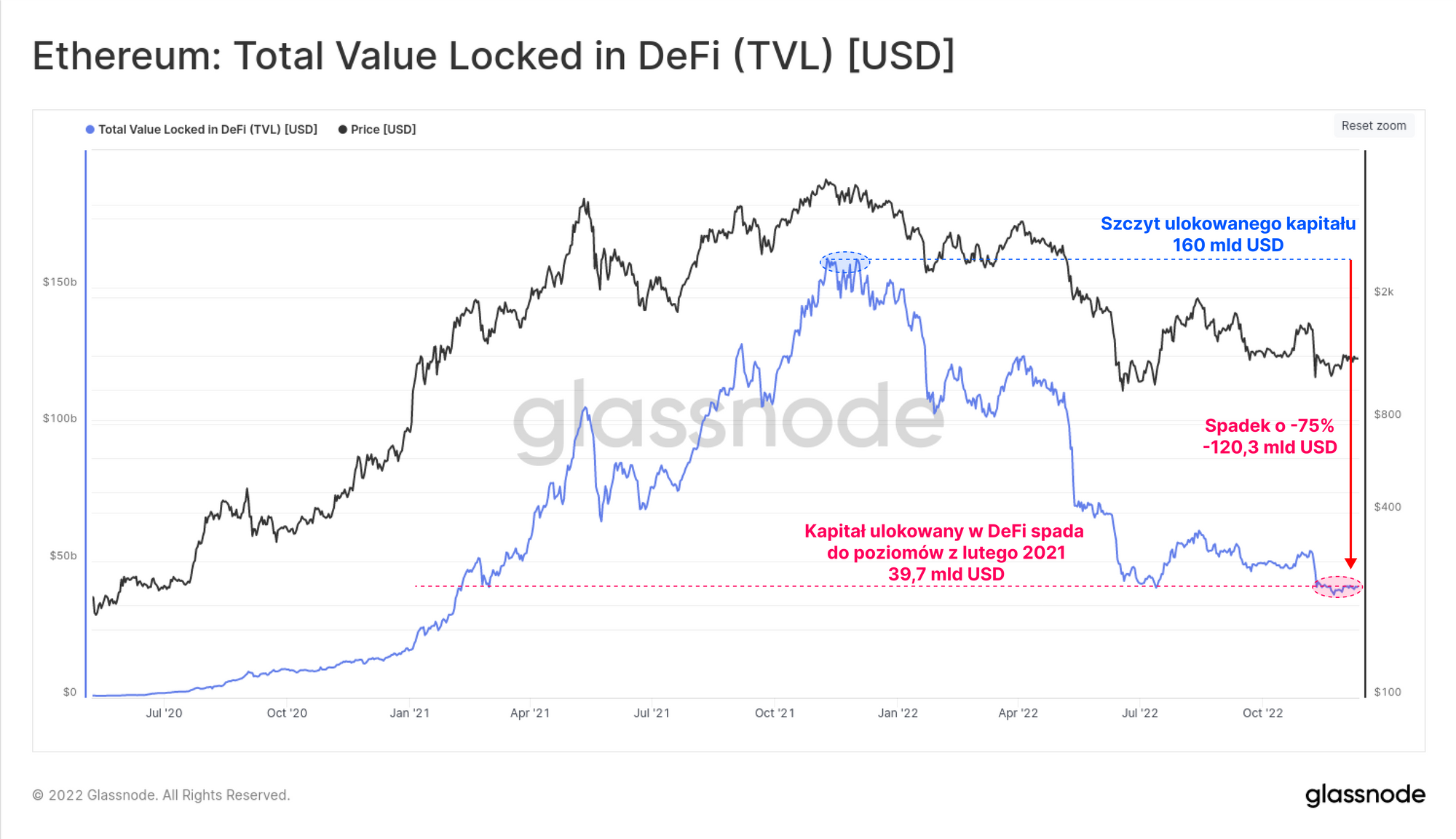 Przy tak ekstremalnym spadku notowań tokenów i poważnym spadku płynności, całkowita wartość kapitału ulokowanego w DeFi dramatycznie spadła. Po osiągnięciu szczytowego poziomu 160 mld USD podczas ATH na Bitcoinie w listopadzie 2021 roku, wartość kapitału ulokowanego w DeFi spadła o ponad 120,3 mld USD (-75%). To oznacza spadek wartości zastawu w DeFi do 39,7 mld USD i cofa nas do poziomów z lutego 2021 roku.
