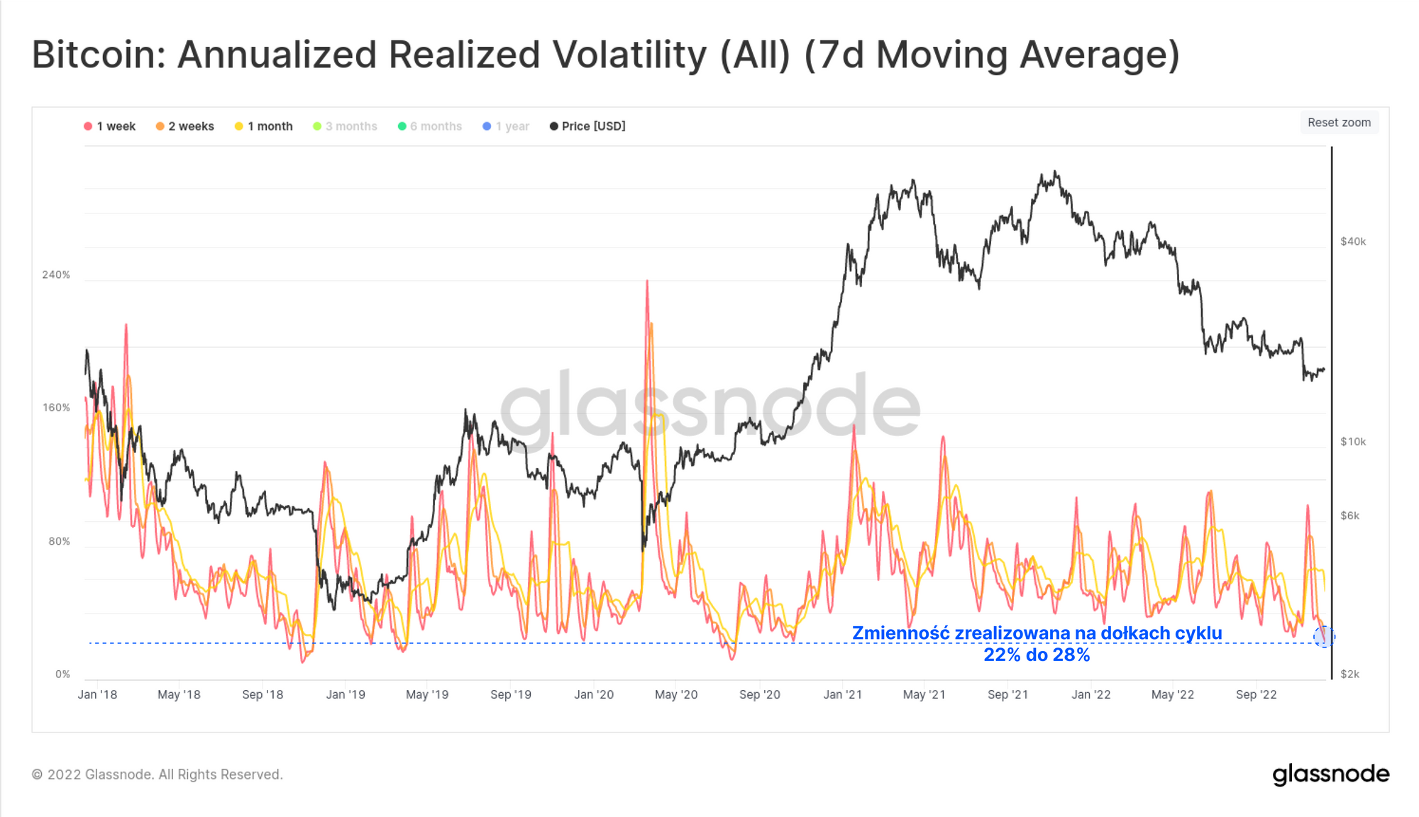 Po tym, co nazwać można naprawdę chaotycznym rokiem, w grudniu rynek Bitcoina stał się niezwykle spokojny. Krótkoterminowa zmienność zrealizowana dla BTC jest obecnie na najniższym poziomie od wielu lat wynoszącym 22% (1 tygodniowa) i 28% (2 tygodniowa), co stanowi najniższy okres zmienności od października 2020 r.
