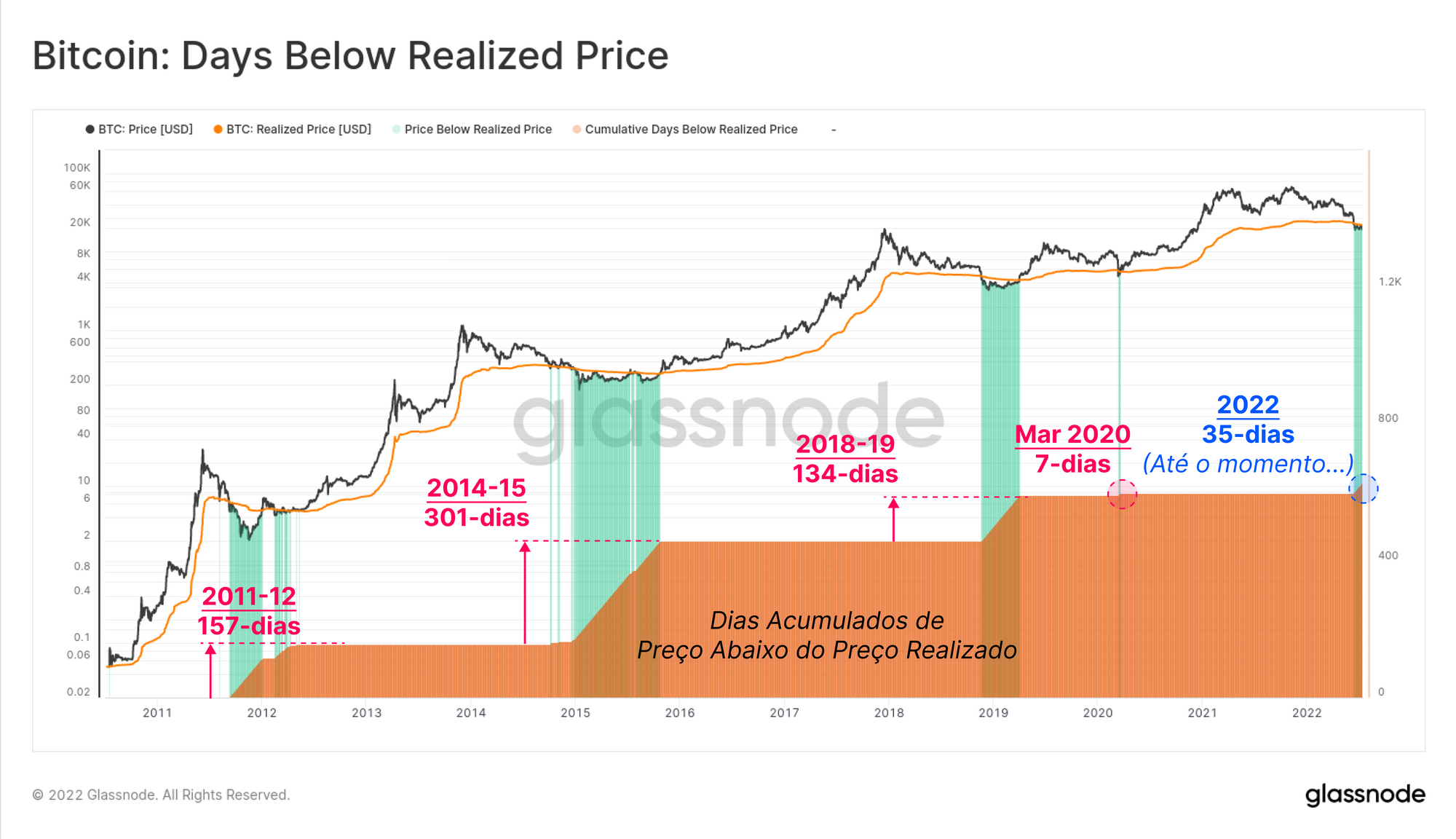 O gráfico abaixo mostra como os ciclos de baixa anteriores atingiram o fundo e estabeleceram uma faixa de acumulação abaixo do preço realizado. O tempo gasto abaixo do preço realizado varia de 7 dias em março de 2020 a 301 dias em 2015.