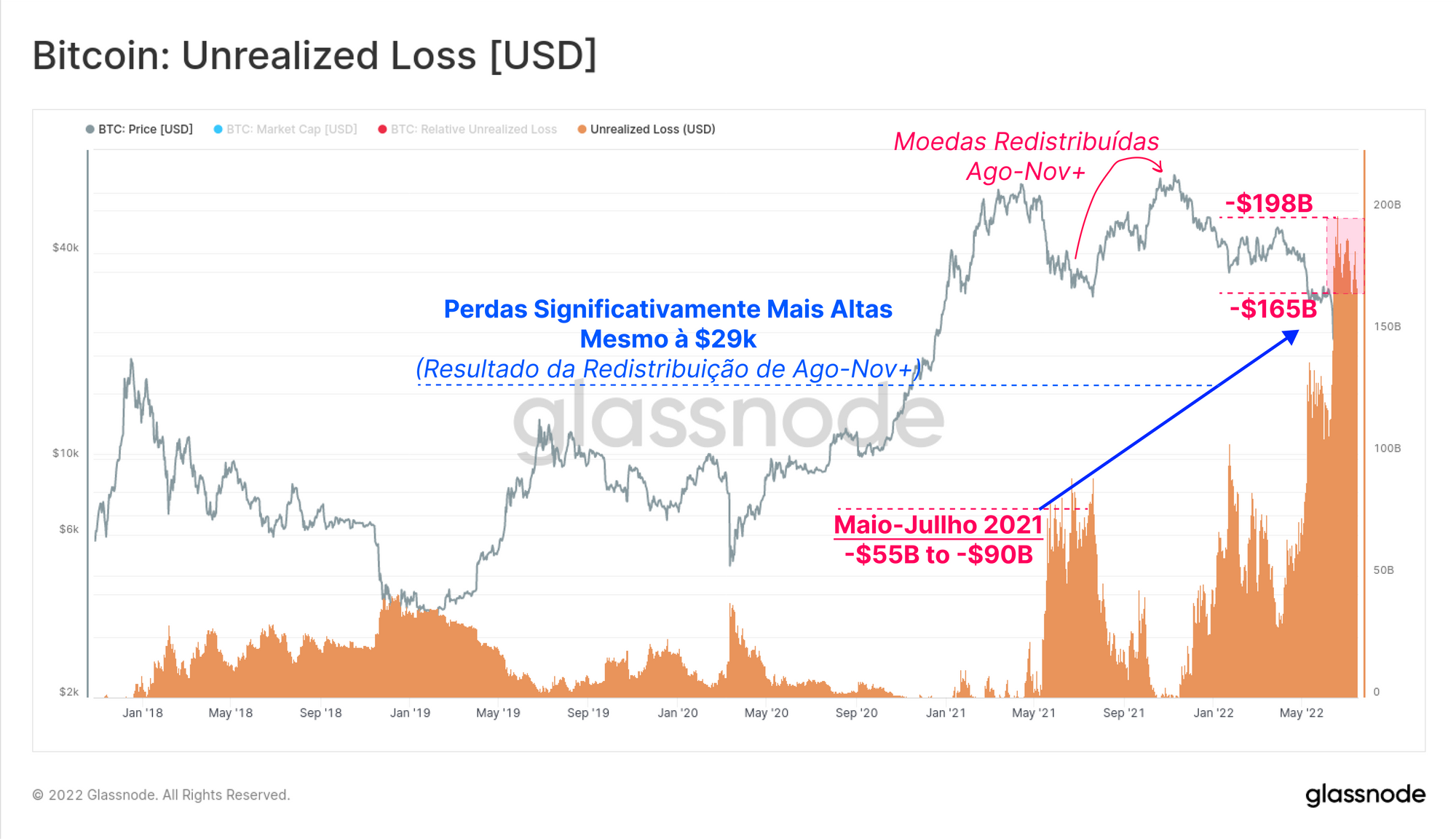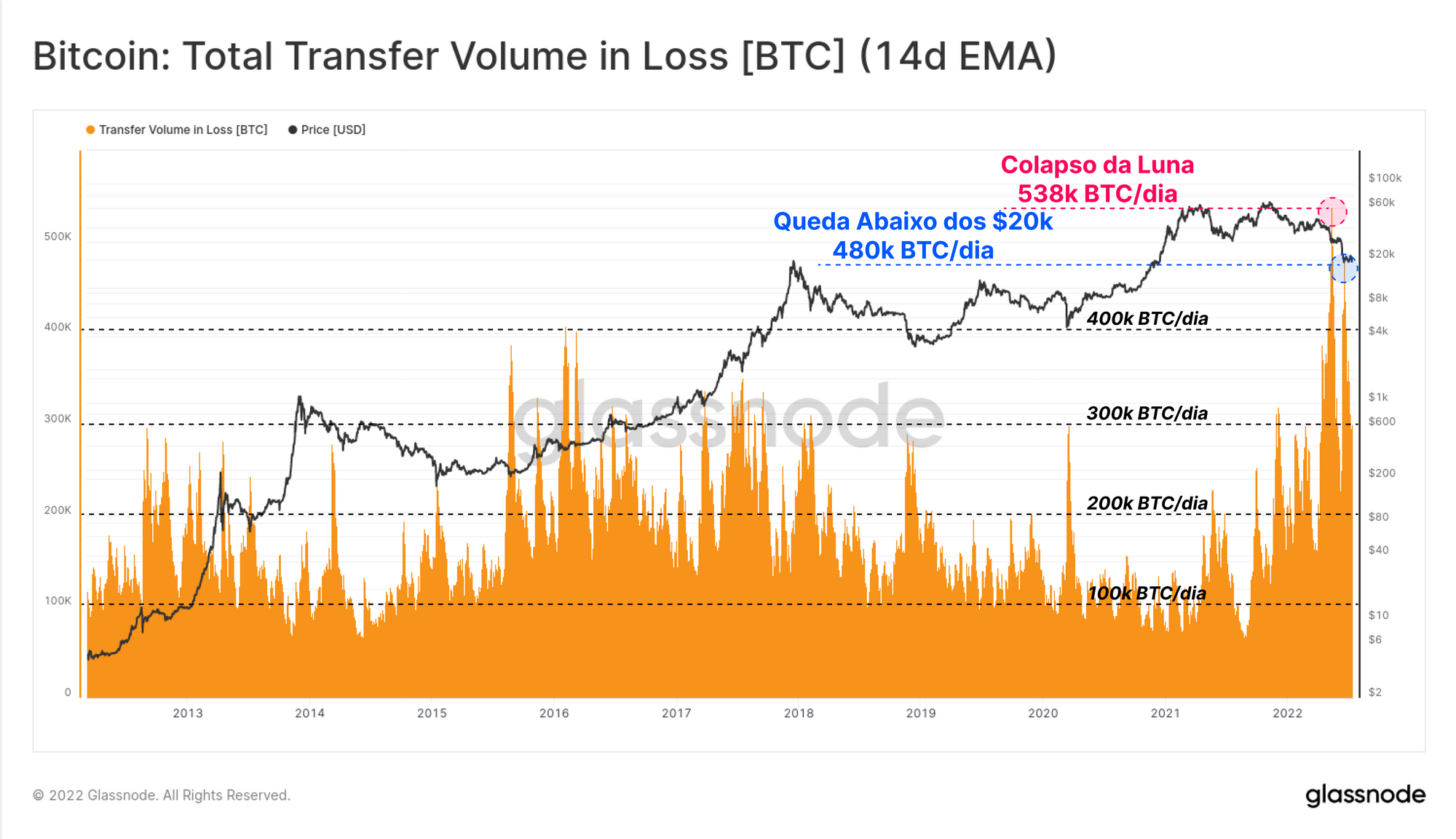 O mesmo pode ser dito sobre as perdas denominadas em BTC, que são tão grandes, que temos que olhar para 2011, quando o BTC estava sendo negociado abaixo de US$ 3, para encontrar um equivalente. Um volume simplesmente impressionante de BTC em perda realizada entre maio e julho, com 538 mil BTC gastos durante o colapso do LUNA e outros 480 mil BTC gastos em 18 de junho.
