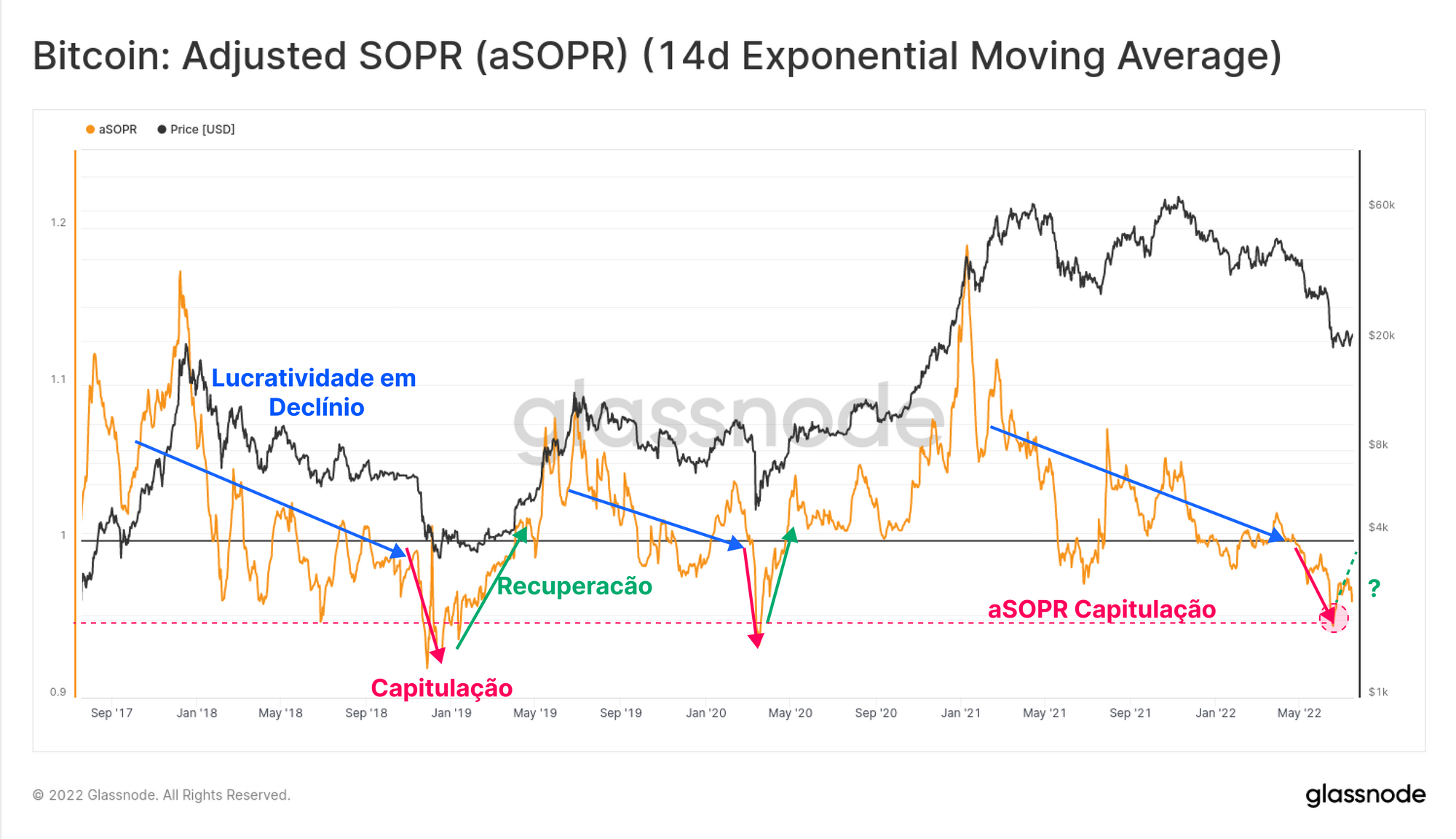 A estrutura da métrica aSOPR também apresenta muitas semelhanças com eventos de capitulação de mercado. À medida que a lucratividade diminui (azul), os investidores começam a realizar perdas cada vez maiores, até que ocorra um momento final de capitulação em cascata (vermelho). O mercado eventualmente atinge a exaustão do vendedor, os preços começam a se recuperar e a dor do investidor começa a diminuir ( 🟢 ).