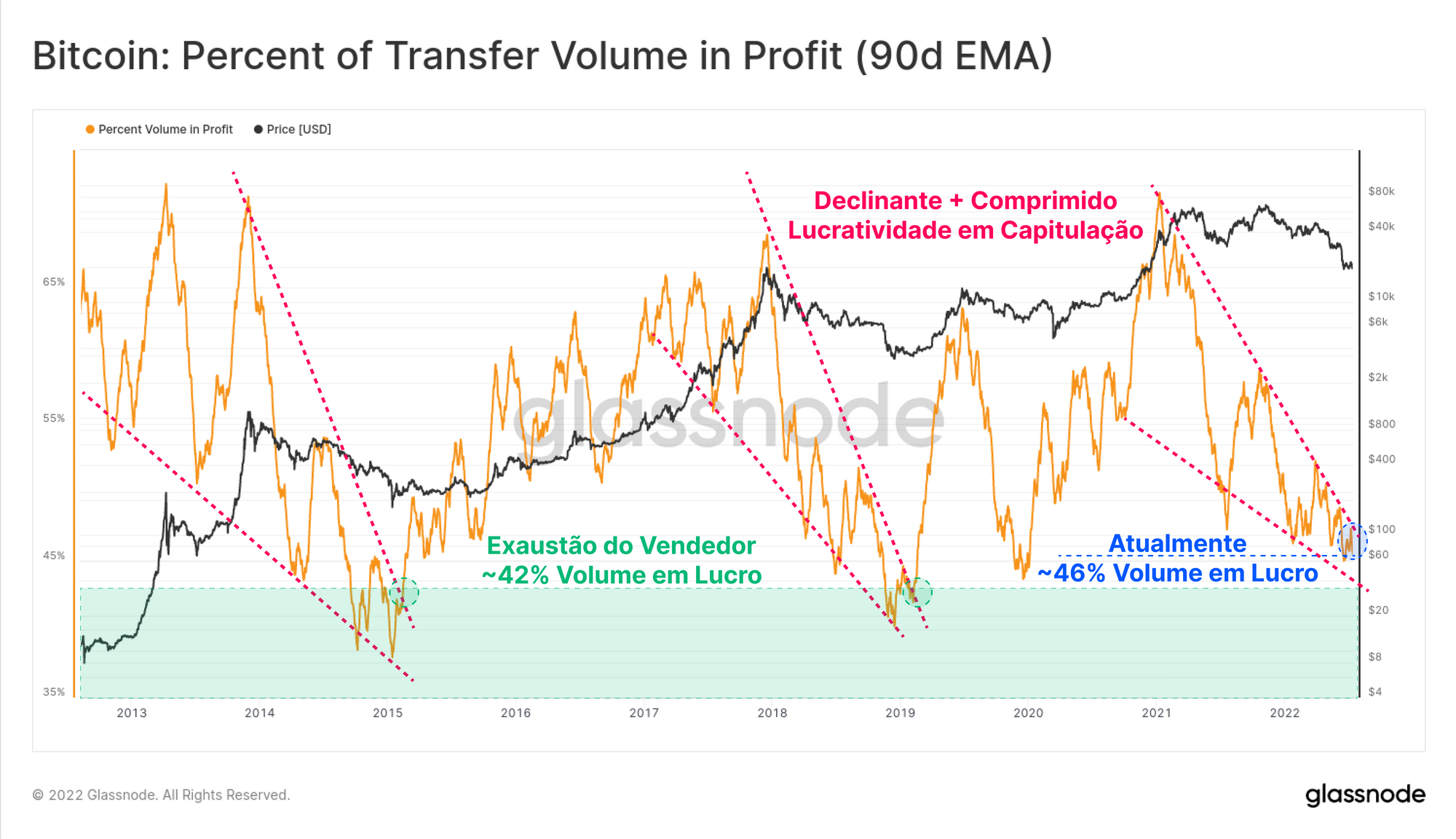 No momento, 54% do volume de transferência está em prejuízo (46% em lucro), o que está muito próximo dos níveis de recuperação de 2015/18. Semelhante ao aSOPR, a recuperação dessa métrica forneceria um sinal de que a exaustão do vendedor pode ter sido atingida e a recuperação pode estar em andamento.