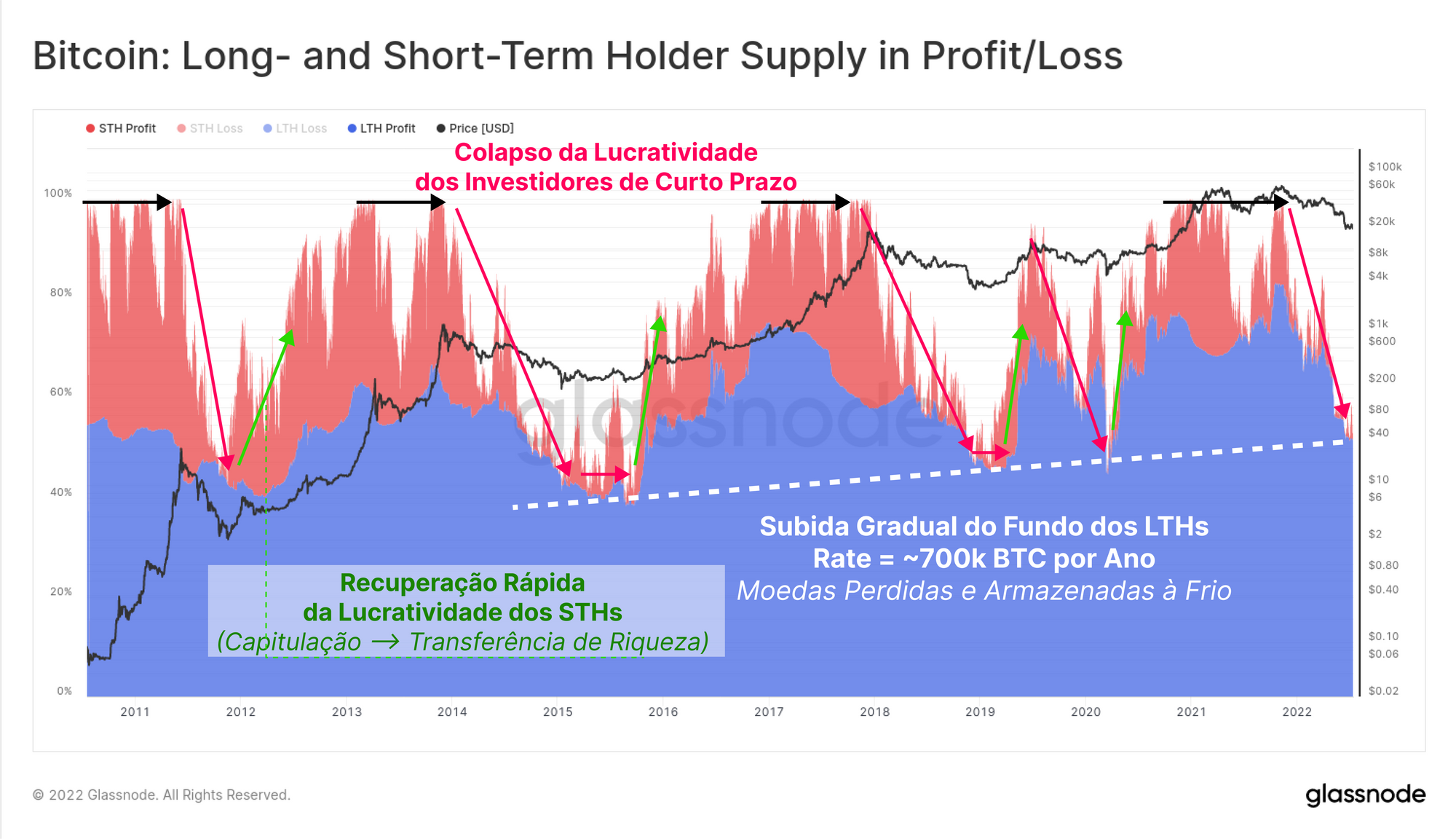 Também podemos inspecionar as moedas com lucro não realizado, desta vez através das lentes dos investidores de longo e curto prazo. Podemos ver que todas as quedas anteriores do mercado de baixa atingem um ponto em que efetivamente não há Investidores de Curto Prazo no lucro, pois o mercado mergulha bem abaixo do preço de aquisição.