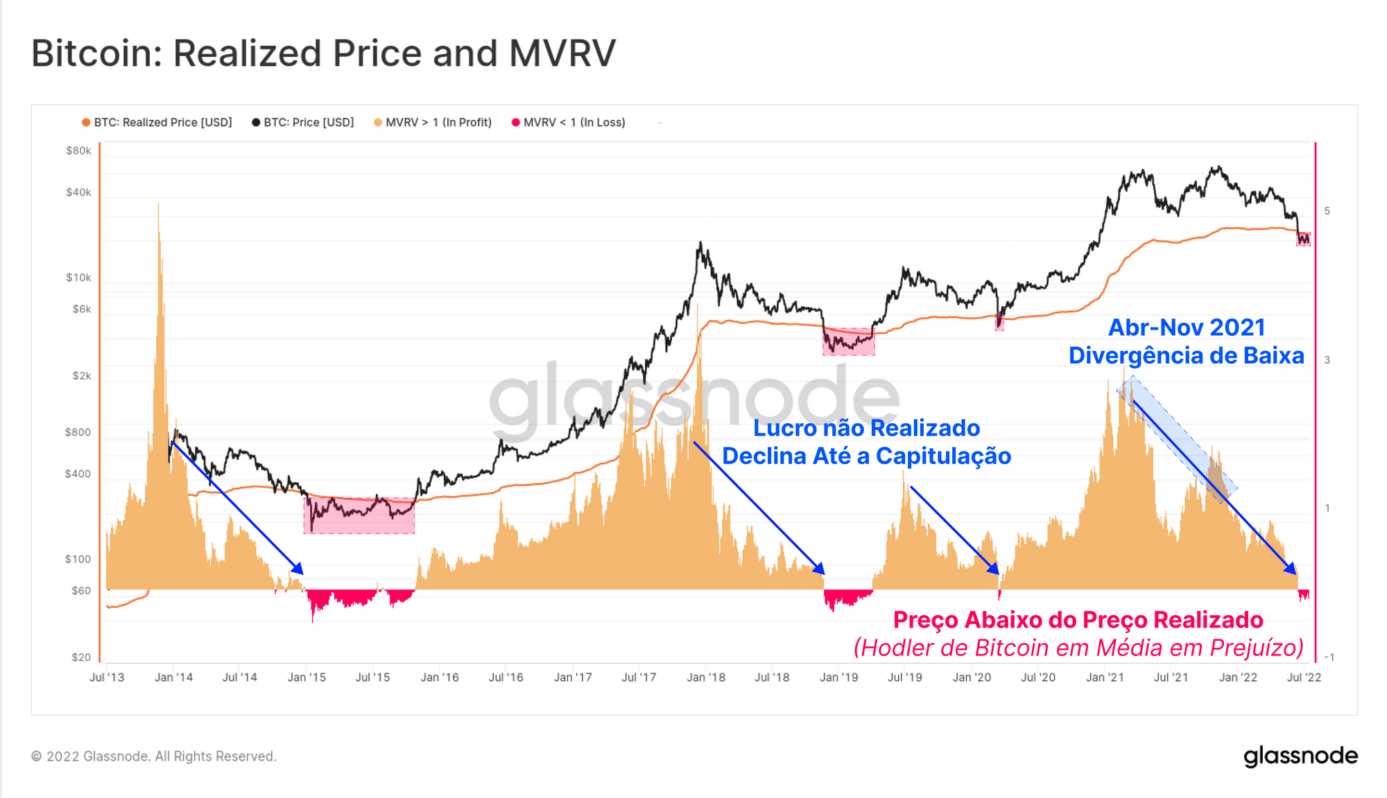 - Índices de MVRV declinantes (🔵) significam redução da lucratividade no sistema. Isso é resultado tanto da queda dos preços (menor MV) quanto da redistribuição de moedas, pois os investidores obtêm lucros e vendem moedas adquiridas a preços mais baratos para novos compradores a preços mais altos (maior RV). Uma grande divergência de baixa pode ser vista entre os ATHs de abril e novembro de 2021 como resultado desse mecanismo (mostrado em azul).