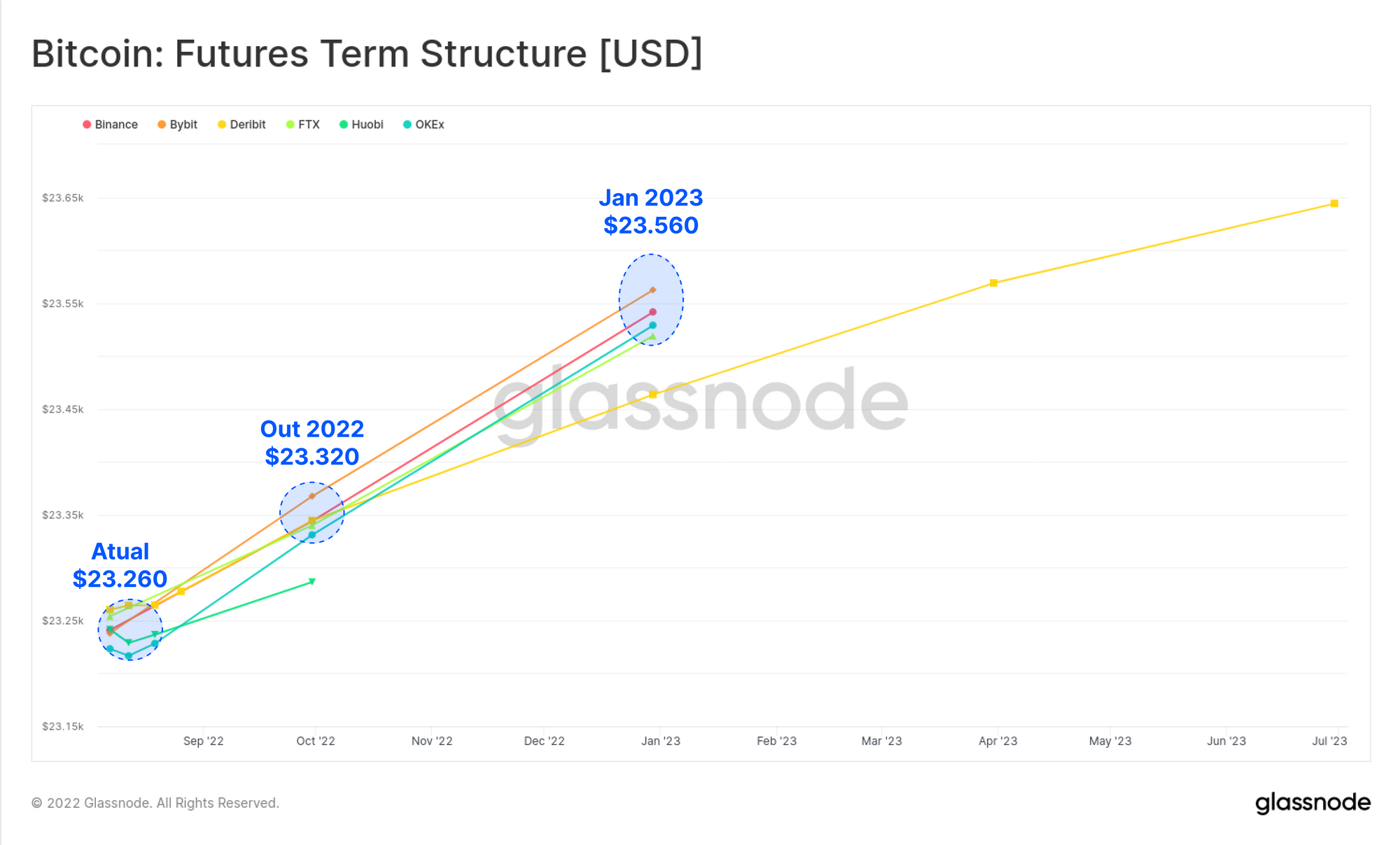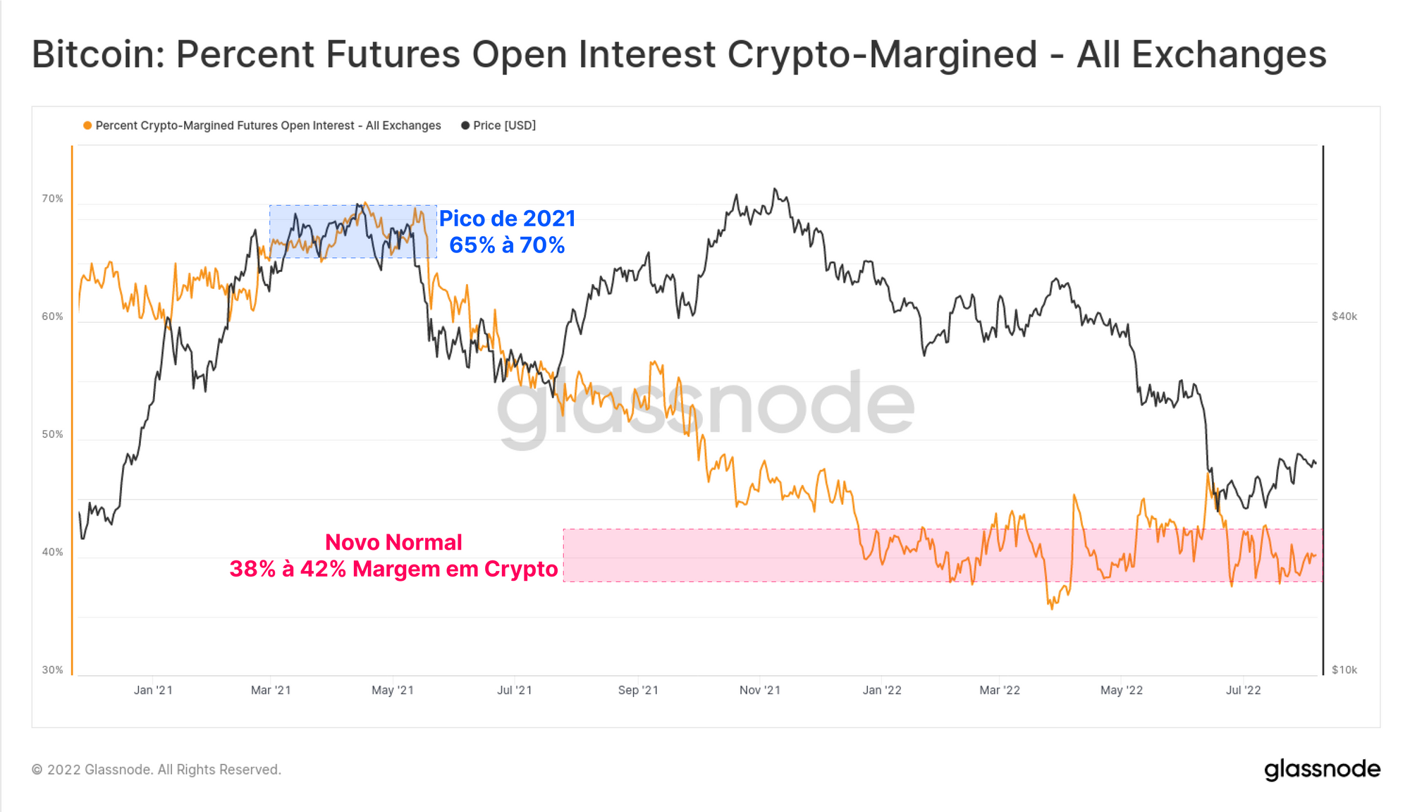 Comparar os contratos em aberto denominados em BTC ajuda a isolar períodos de crescimento na alavancagem de futuros, das mudanças no preço da moeda. Com base em USD, os contratos em aberto atual é de US$ 12,4 bilhões, o que é relativamente baixo, e equivalente ao mercado de alta inicial em janeiro de 2021, e às quedas para US$ 29 mil em junho de 2021.