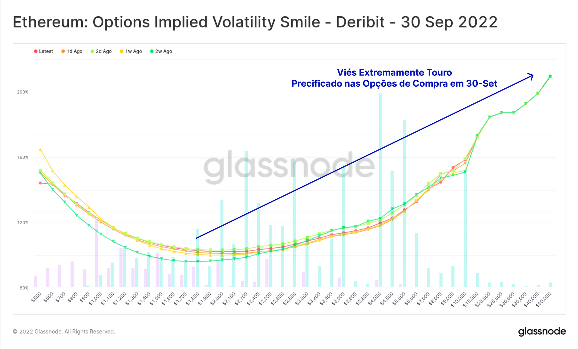 Essa grande demanda por opções de compra de ETH com vencimento em setembro levou o sorriso da volatilidade a um estado de viés extremo de alta. Sobrepostas neste gráfico estão as barras de juros abertas, onde pode ser visto que a inclinação ascendente é fortemente impulsionada por investidores dispostos a pagar um prêmio pela exposição em opções de compra.