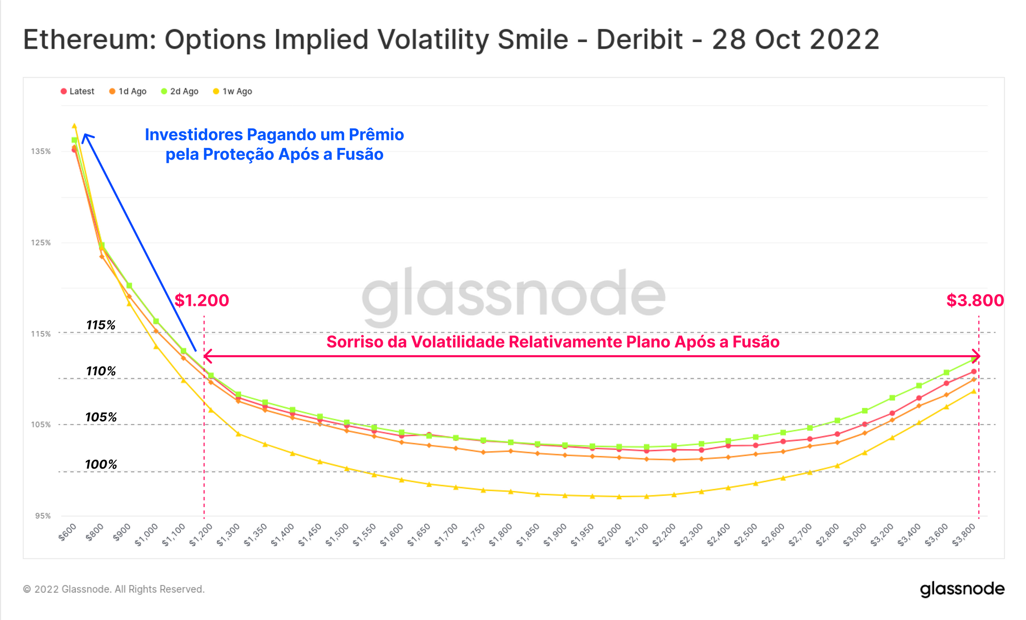 Se compararmos a forma e a escala do sorriso de volatilidade de setembro com outubro, podemos ver um declínio dramático na cauda direita, com uma forma relativamente plana e uma volatilidade implícita abaixo de 110% ao longo da curva. Isso sugere uma demanda relativamente menor de exposição ao ETH por meio de opções após o evento da Fusão.