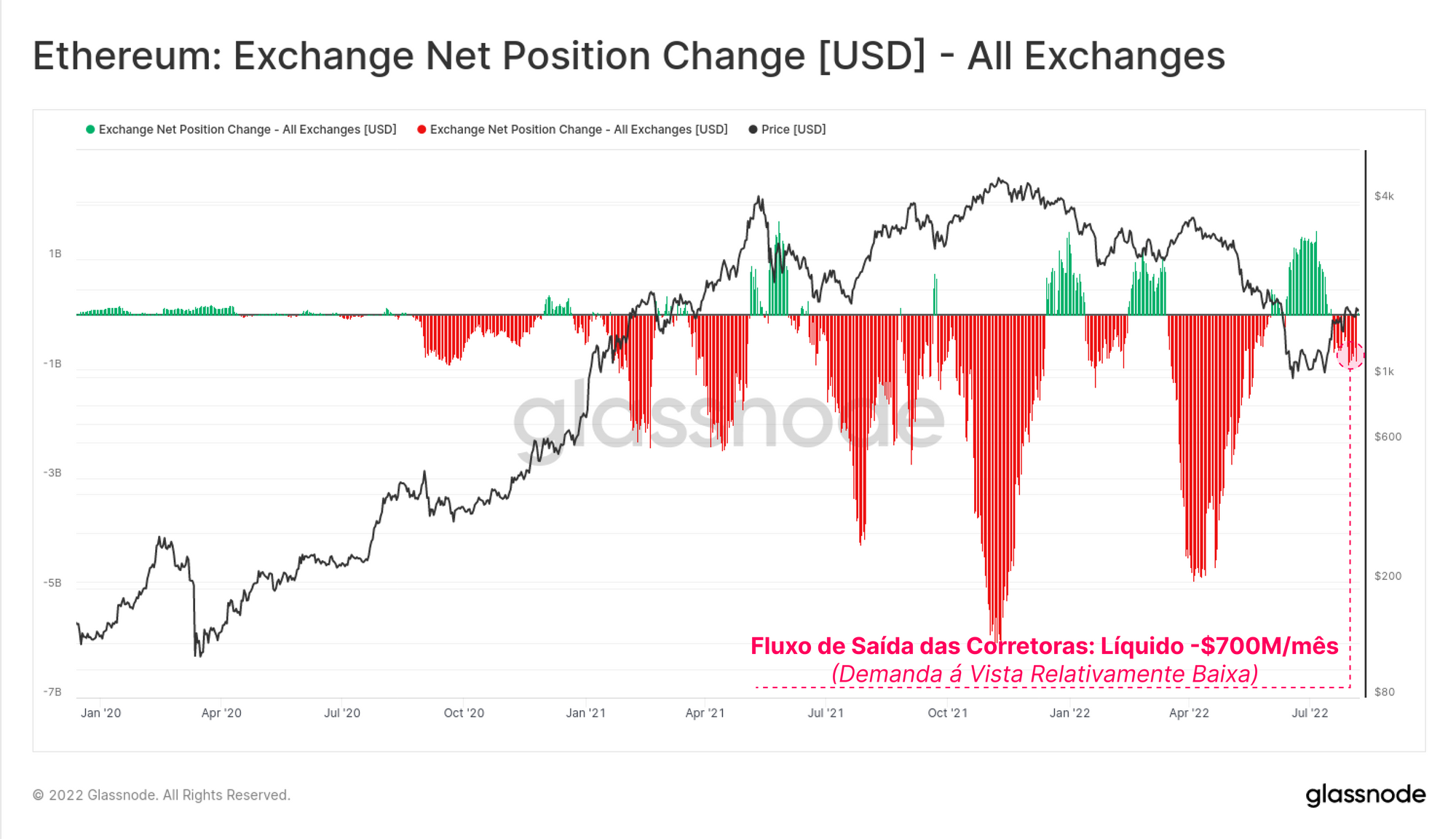 Dado o forte viés de alta nos mercados de opções de ETH, seria esperado que a demanda à vista fosse bastante forte. No entanto, uma olhada na mudança da posição líquida das corretoras mostra apenas -US$ 700 milhões em saques líquidos por mês.