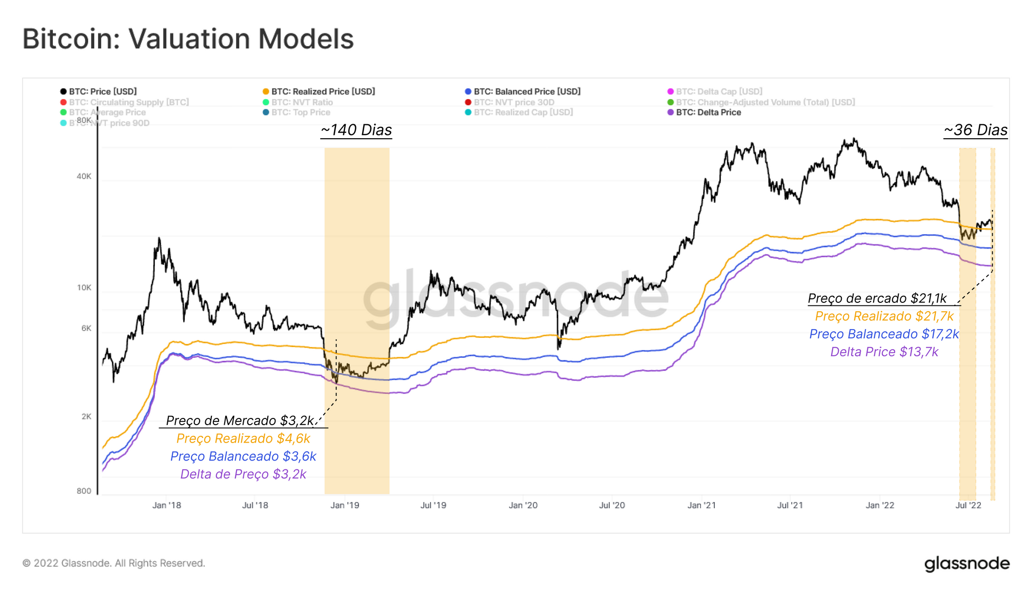 Com o Preço Realizado agora acima Preço de Mercado, dois modelos adicionais de preços on-chain ficam como níveis de suporte em potencial. Preço Delta e Preço Balanceado são modelos on-chain bem conhecidos com um histórico de convergência com preços em torno dos fundos do ciclo.