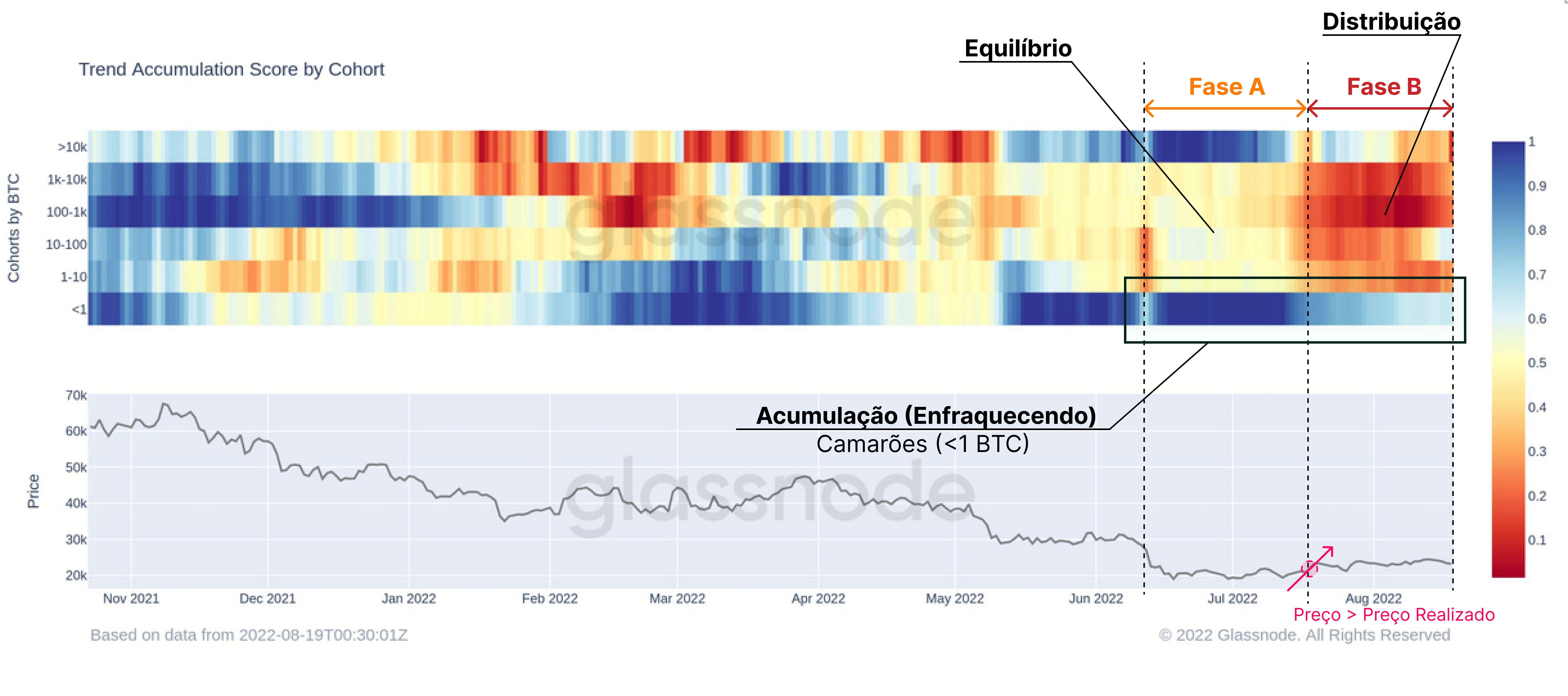 - Fase A 🟡: Após cair abaixo de US$ 20 mil, Camarões (<1 BTC) e Baleias (> 10 mil BTC, excluindo corretoras e mineradores) foram acumuladores líquidos, enquanto outras grupos de investidores permaeceram em equilíbrio.
