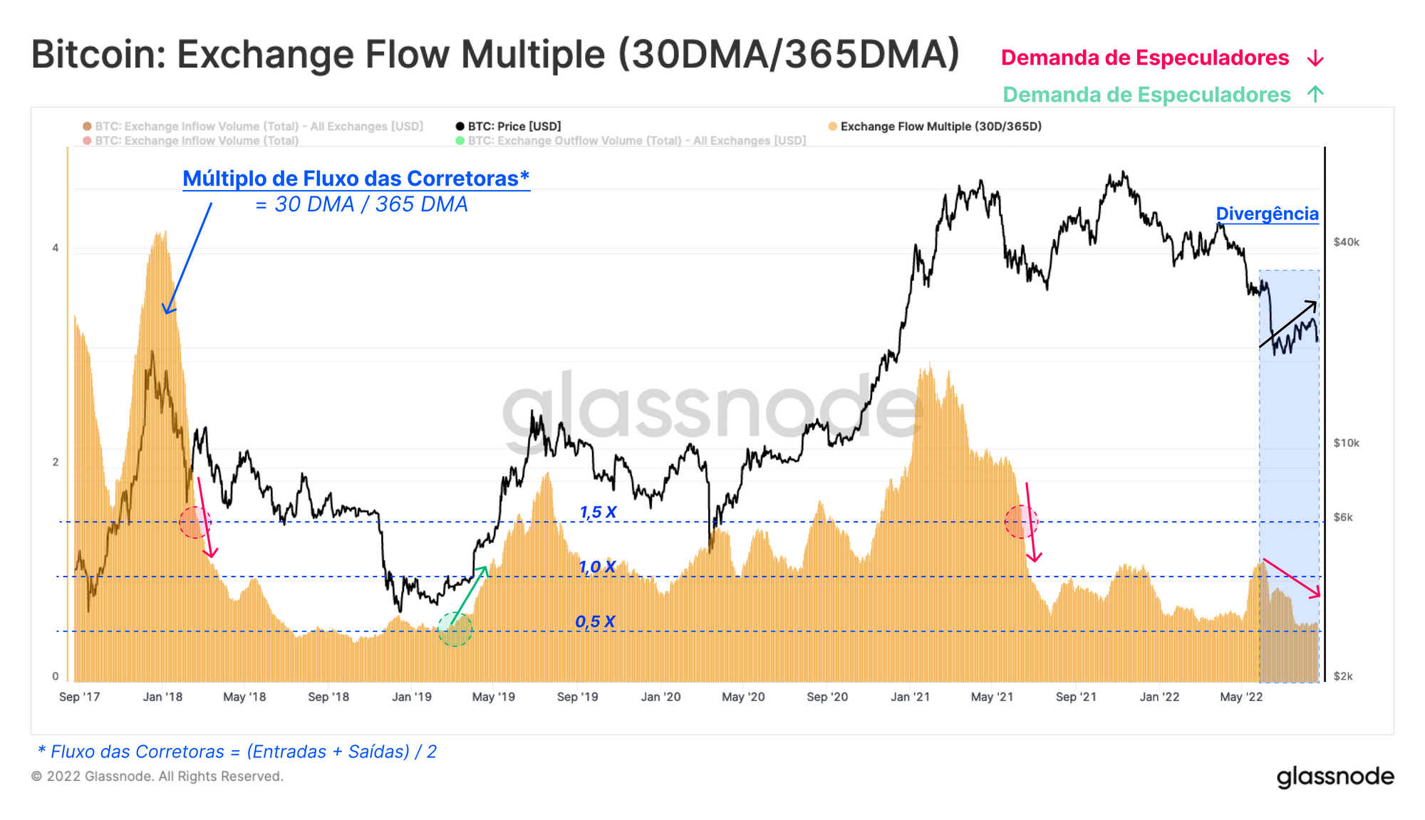 O Múltiplo de Fluxo das Corretoras pode ser usado como um nível de limite para mapear os estágios iniciais 🔴 e finais 🟢 de um mercado urso. De acordo com os gráficos discutidos anteriormente, o recente retorno dos preços do fundo de junho de 2022 🟦 não foi acompanhado por um fluxo de entrada significativo de especuladores no mercado.