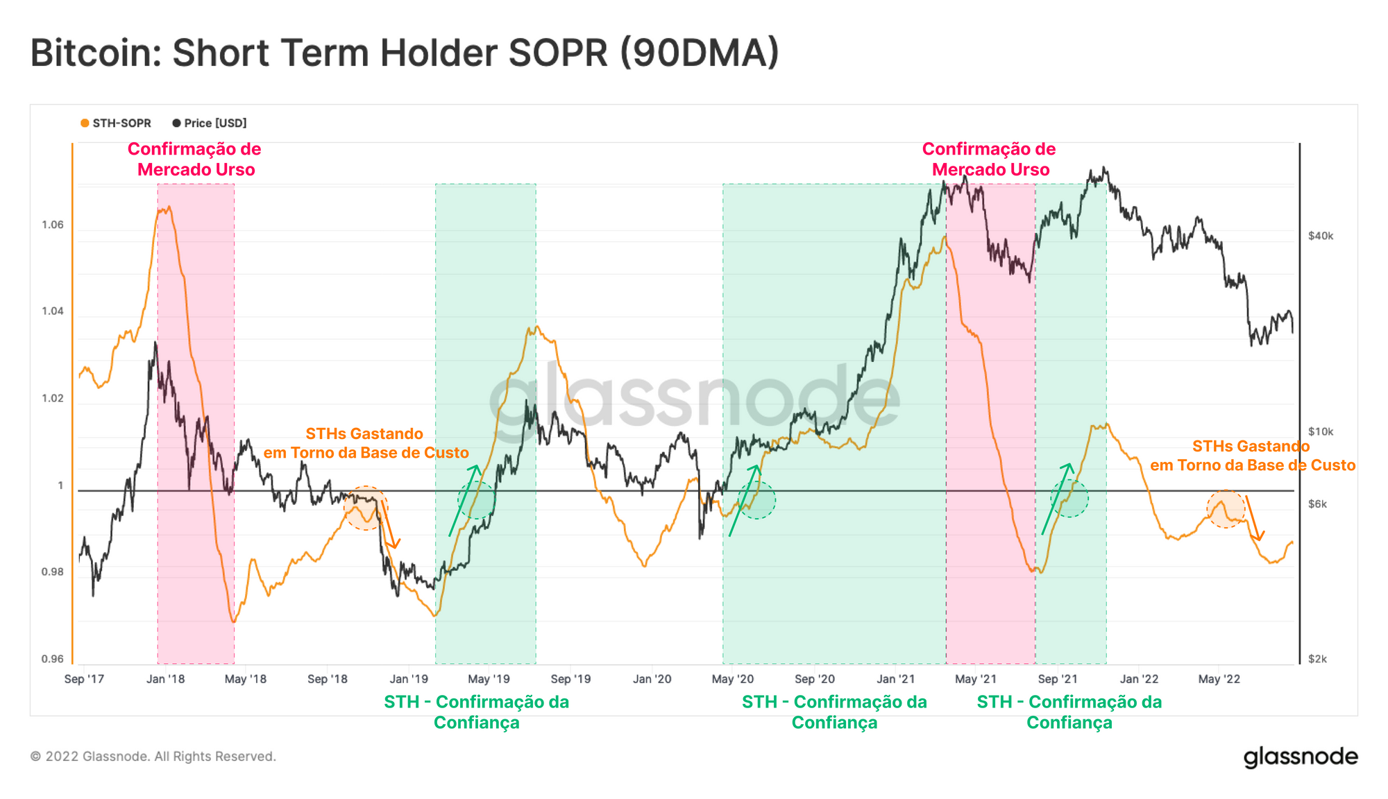 Observando o SOPR dos Investidores de Curto Prazo (90DMA), podemos ver uma proporção trimestralmente suavizada dos preços de venda do investidor em relação aos preços de compra. O nível de limite importante nessa métrica é um cruzamento de 1,0, com uma quebra acima indicando um retorno aos gastos lucrativos.