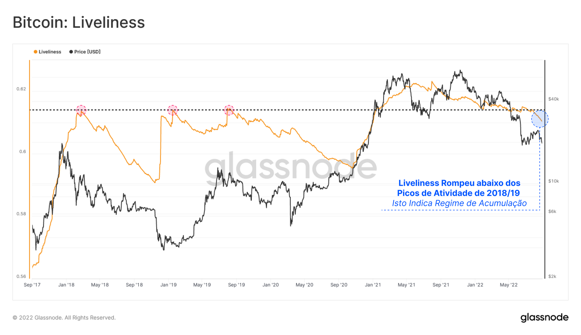 Para avaliar o estado macro do comportamento de longo prazo do Bitcoin, inicialmente podemos recorrer à métrica "Liveliness". "Liveliness" mede a atividade de rede agregada equilibrando a Destruição de Dias de Moeda agregada de todos os tempos com a Criação de Dias de Moedas de todos os tempos. A tendência e o gradiente fornecem informações sobre preferências de mercado mais amplas para HODLing (tendências de baixa) ou gastos (tendências de alta).
