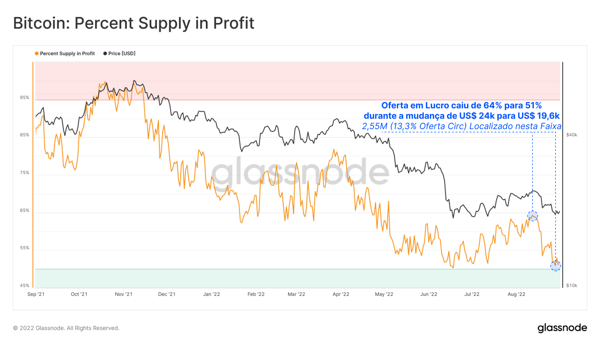 Portanto, podemos observar que 13,3% da oferta circulante perdeu seu status lucrativo durante a queda de US$ 24 mil para US$ 19,6 mil. Isso sugere que 2,55 milhões (13,3%) da oferta circulante foi negociada pela última vez dentro dessa faixa de preço.